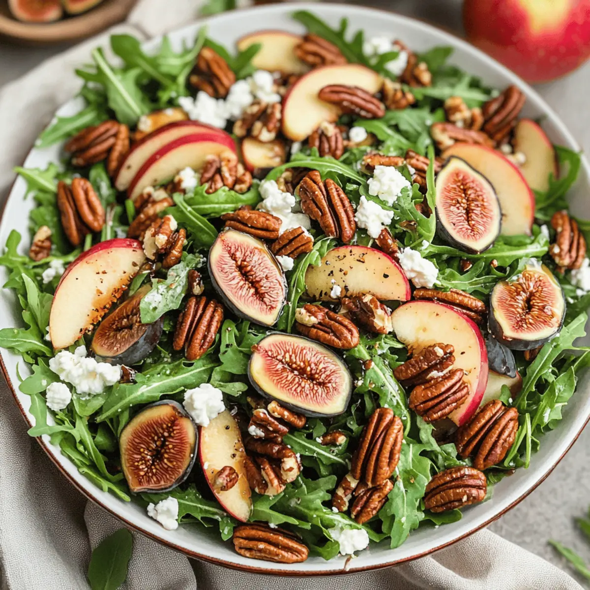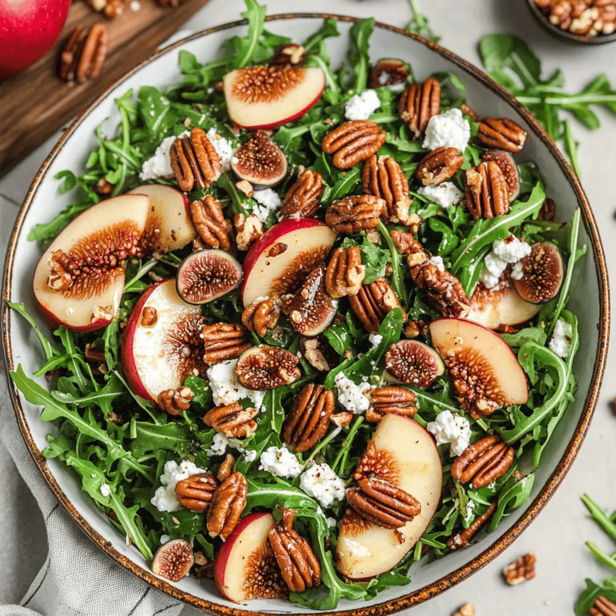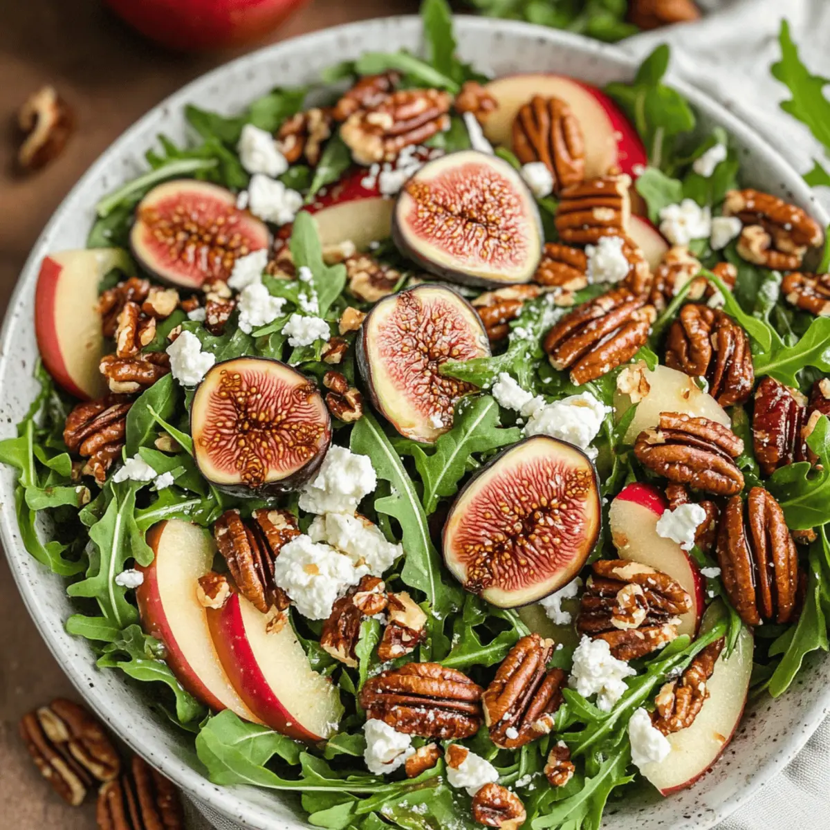 - In a large salad bowl, layer arugula, thinly sliced apples, quartered figs, and crumbled goat cheese; sprinkle with roasted pecans.