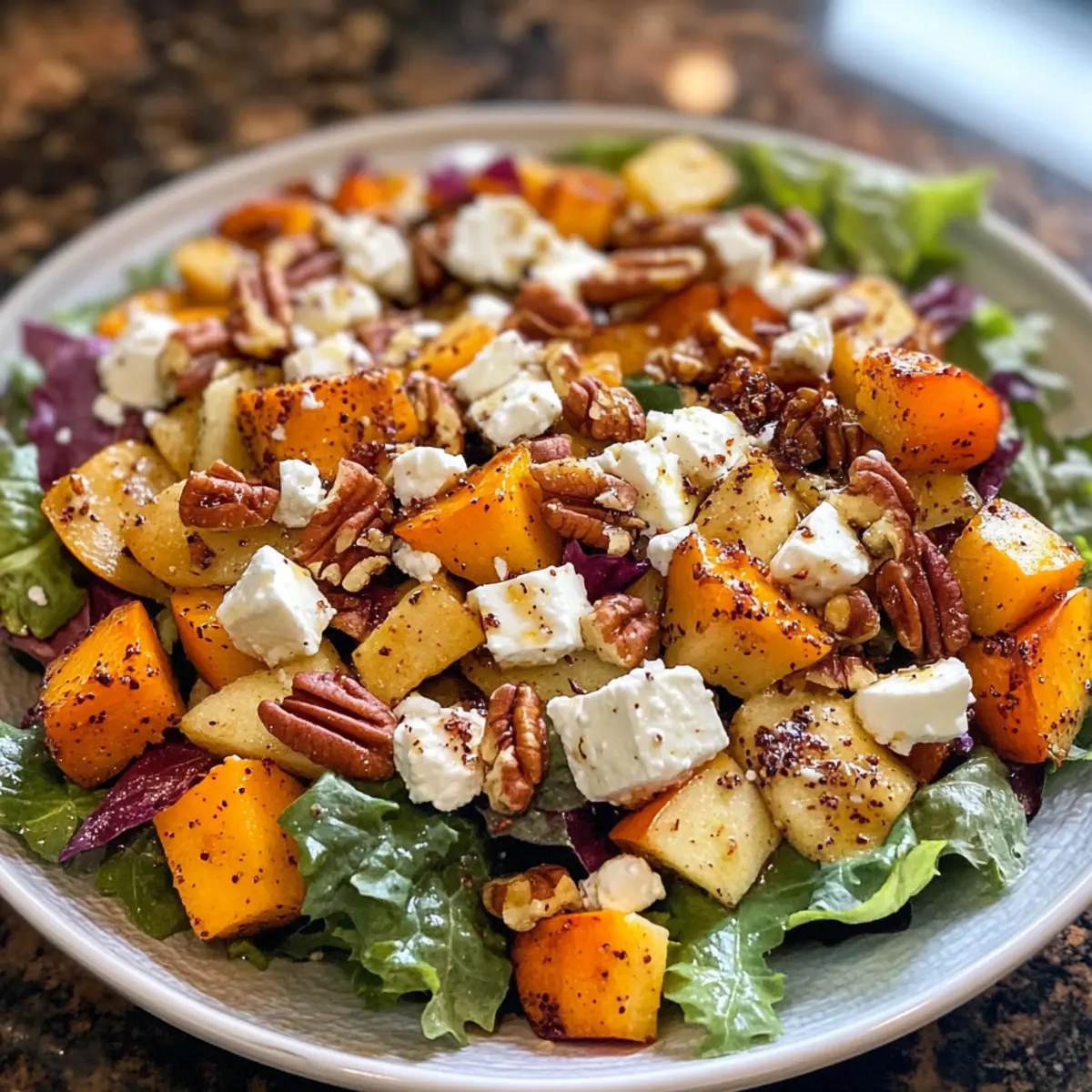 Once the roasted butternut squash has cooled slightly, add it to the large bowl with the mixed greens and other ingredients. Drizzle the prepared vinaigrette over the salad, allowing the dressing to enhance the beautiful colors and flavors of the Autumn Harvest Honeycrisp Apple and Feta Salad.