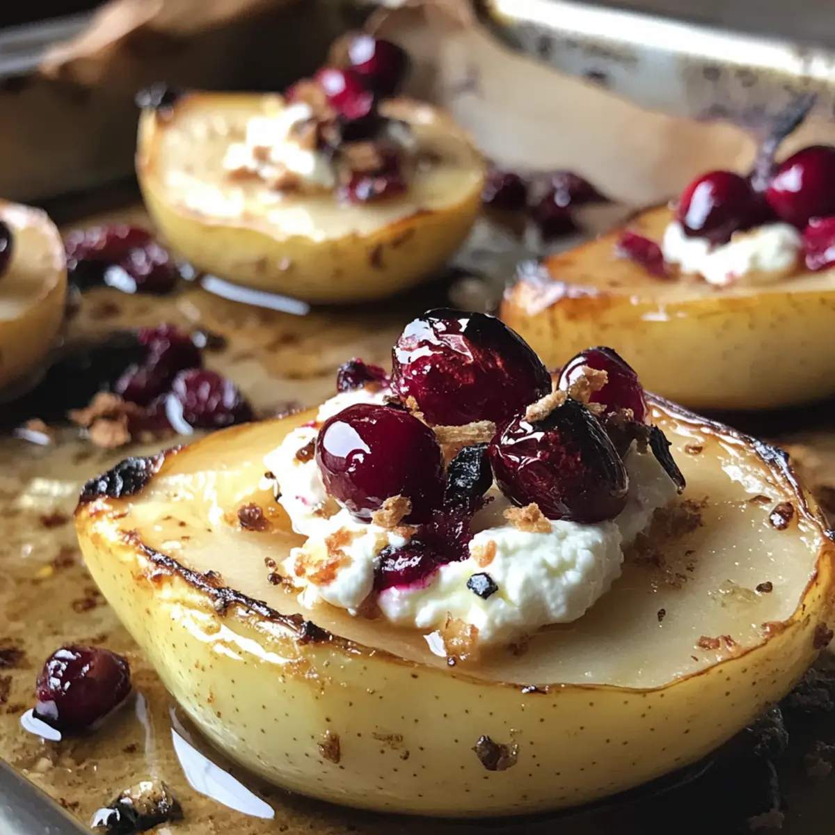 Once the pears have cooled just enough to handle, remove them from the baking dish. Fill each hollow with a generous scoop of creamy goat cheese, allowing it to blend with the buttery warmth of the pears. Top each filled cavity with a spoonful of the tart cranberry compote, showcasing the bright colors.