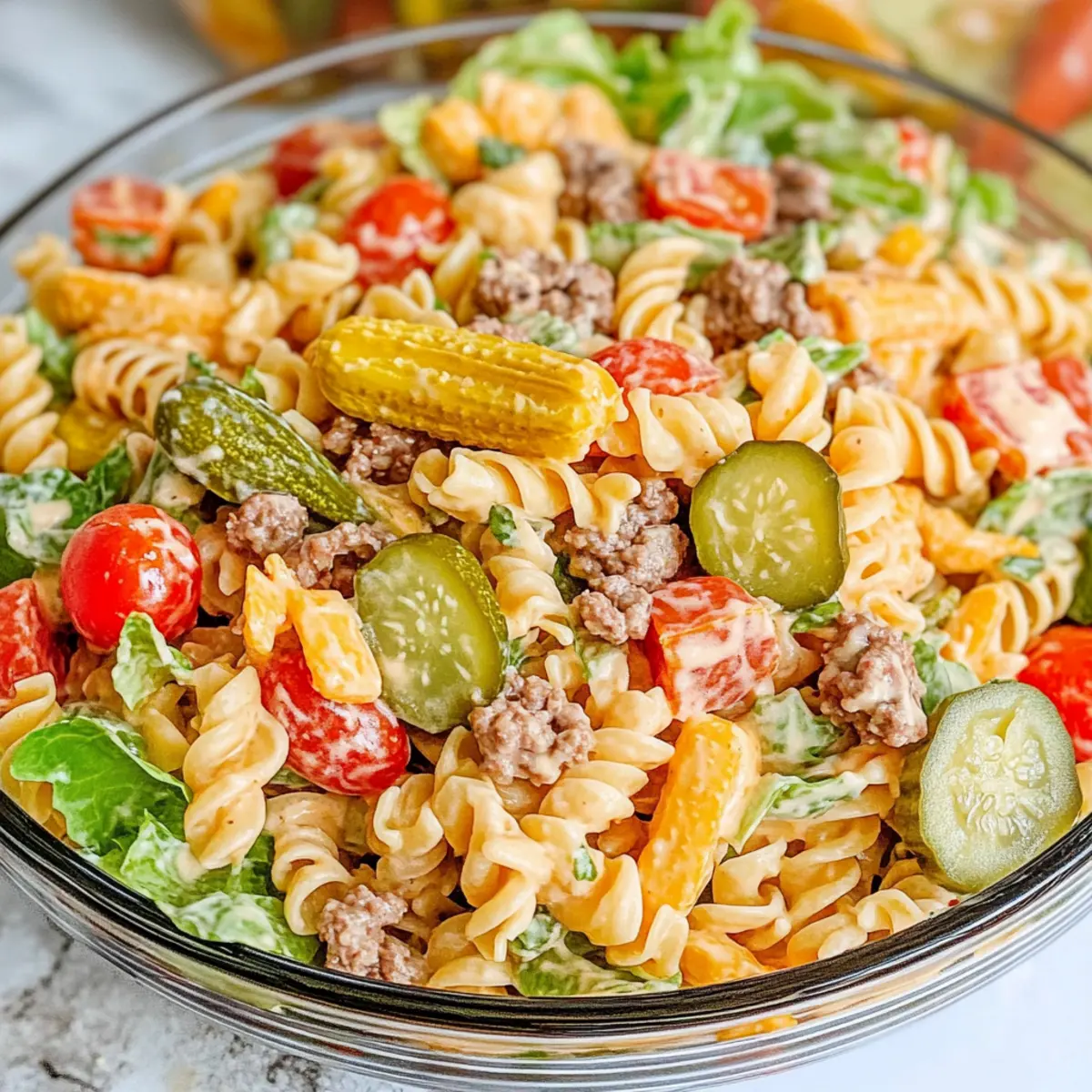 Preparing the Big Mac Pasta Salad in advance is a fantastic way to save time on busy days! You can cook the ground beef and pasta, and combine all non-lettuce ingredients in advance, refrigerating them in an airtight container for up to 3 days. Just remember to keep the shredded lettuce separate until you’re ready to serve, as this will help maintain its crunch. Before serving, simply mix in the lettuce and your delicious dressing to bring everything together. This way, you can enjoy a refreshing meal with all the classic Big Mac flavors, made effortlessly easy for your gatherings!