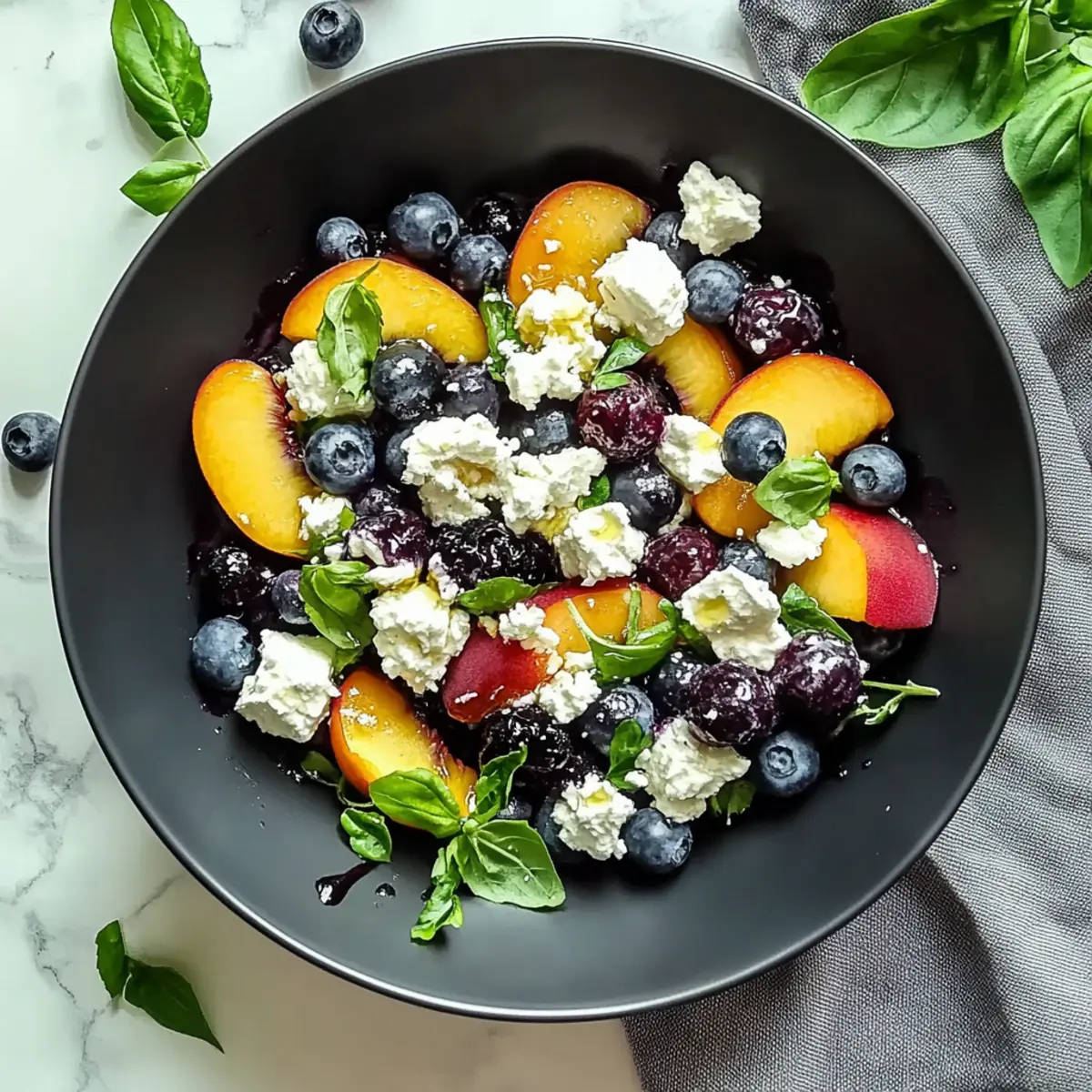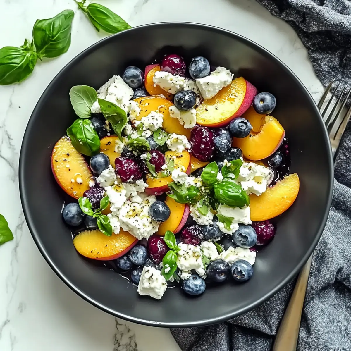 Crumble a generous ½ cup of feta cheese over the fruit mixture in the bowl. The creamy texture of the feta enhances the sweetness of the peaches and blueberries, creating a lovely contrast. Take a moment to appreciate the harmonious blending of flavors that your Blueberry Peach Feta Salad is beginning to showcase.