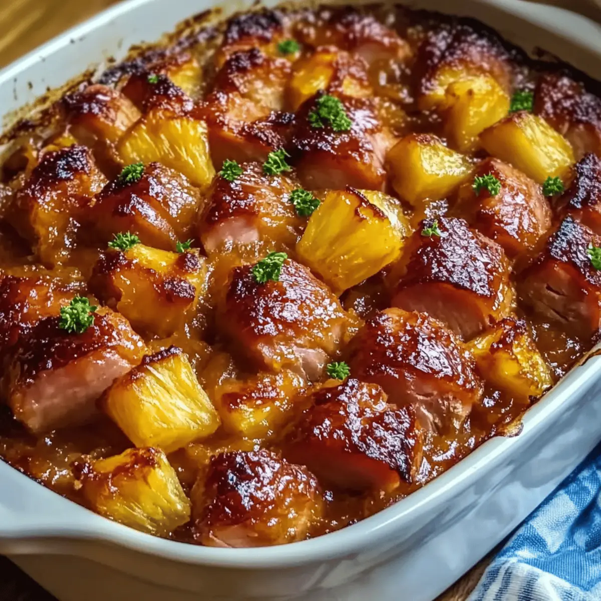 - Spread the diced ham and pineapple chunks in the baking dish. Pour the glaze over and toss to coat evenly.