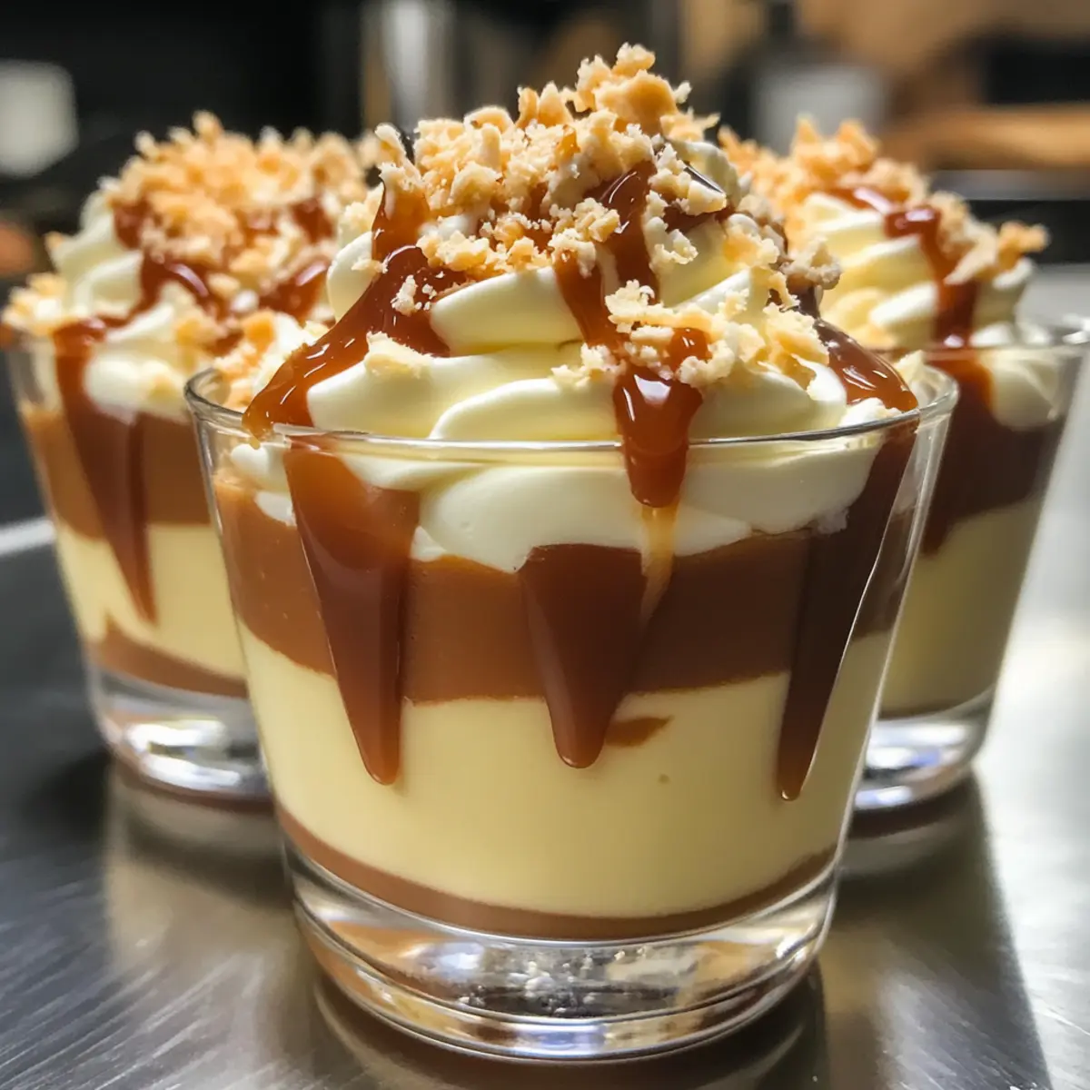 - Pipe mousse into mini dessert cups, layering with caramel if desired.