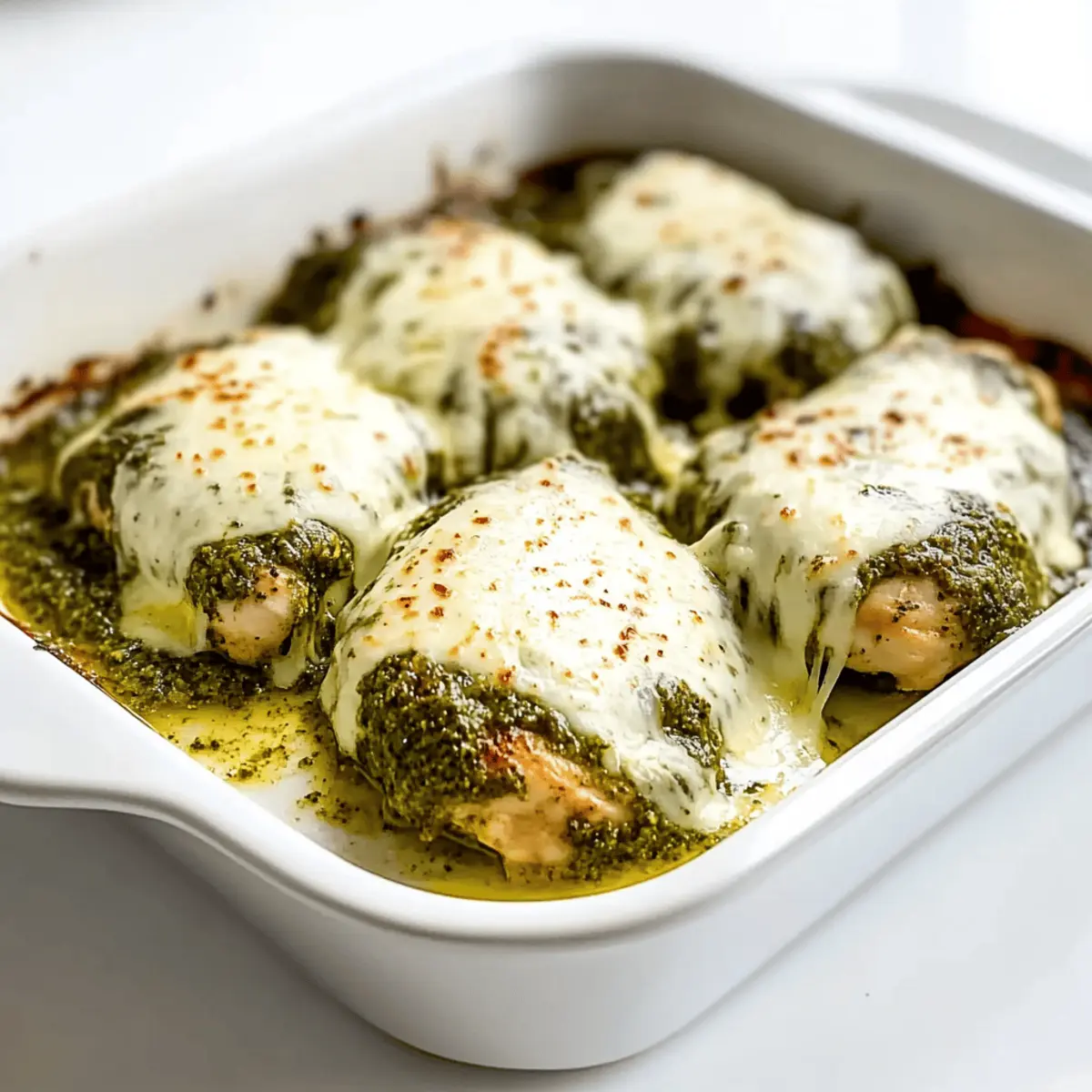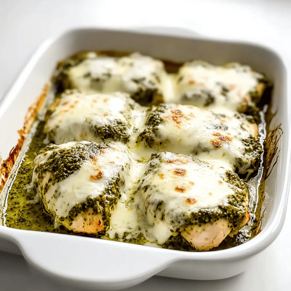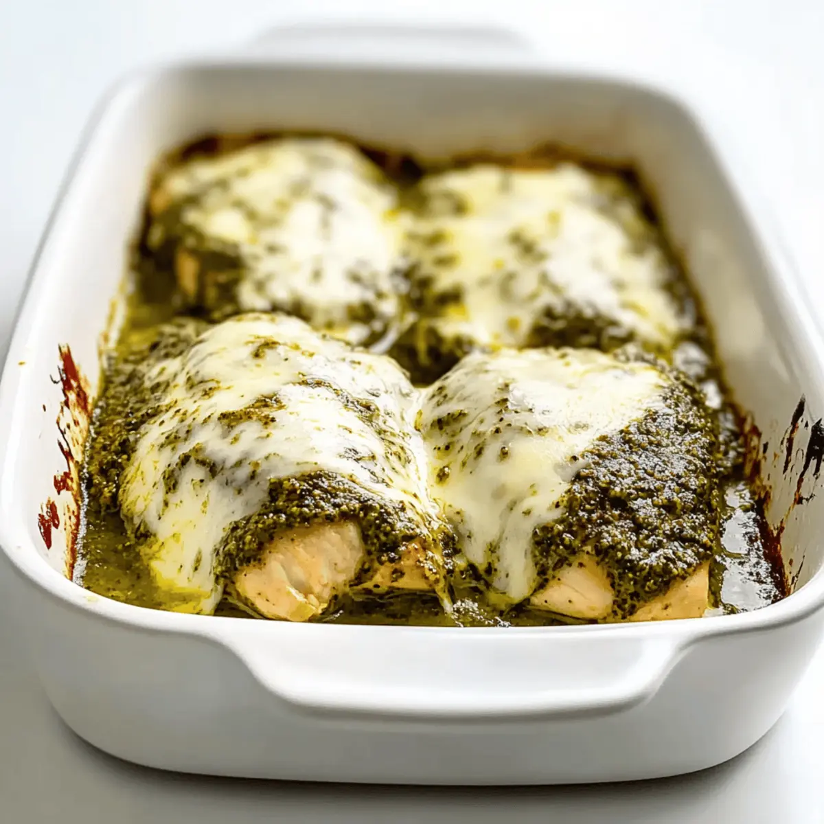 After removing the dish from the oven, let the Cheesy Pesto Baked Chicken rest for about a minute. This resting period allows the juices to redistribute, ensuring every bite is flavorful and moist. Optionally, sprinkle with chili pepper flakes before serving for a little kick of heat.