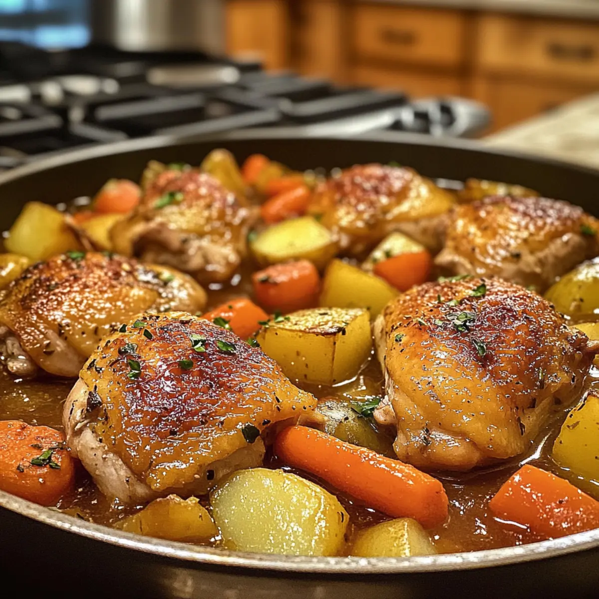After the initial baking, carefully uncover the pot and stir in the halved baby potatoes, rearranging the chicken to make room. Return the pot to the oven uncovered for an additional 40 minutes, allowing the skin to crisp up and the sauce to thicken beautifully around the veggies and chicken.