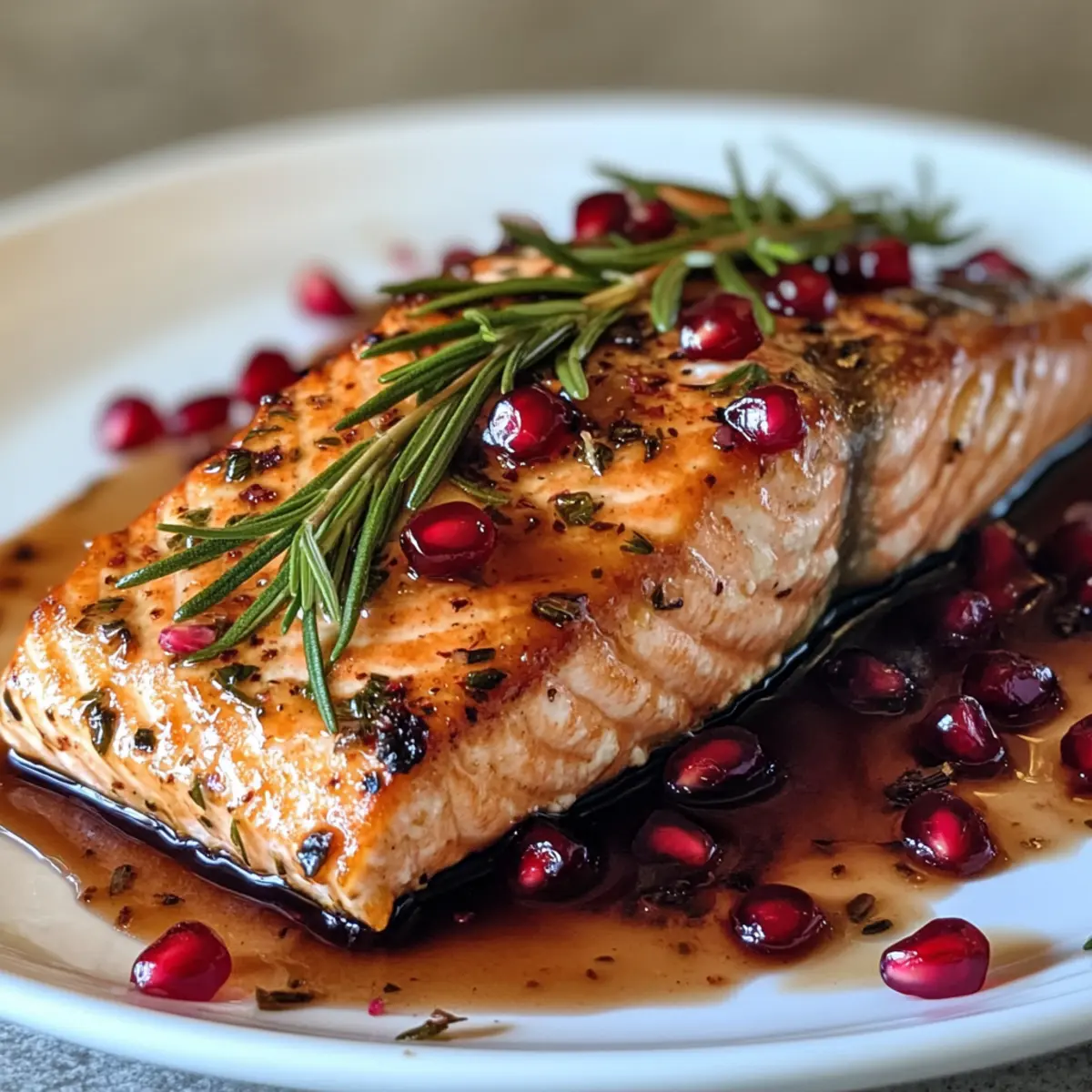 - Garnish the baked salmon with rosemary sprigs and pomegranate seeds before serving.