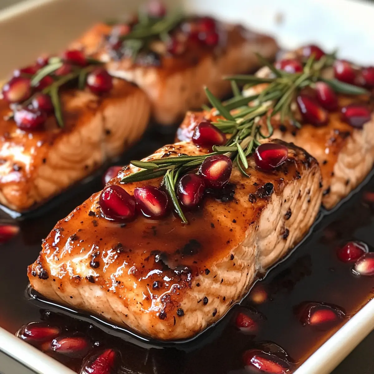 - Remove the salmon from the oven, spoon any remaining sauce over the fillets, and garnish with pomegranate seeds and rosemary.
