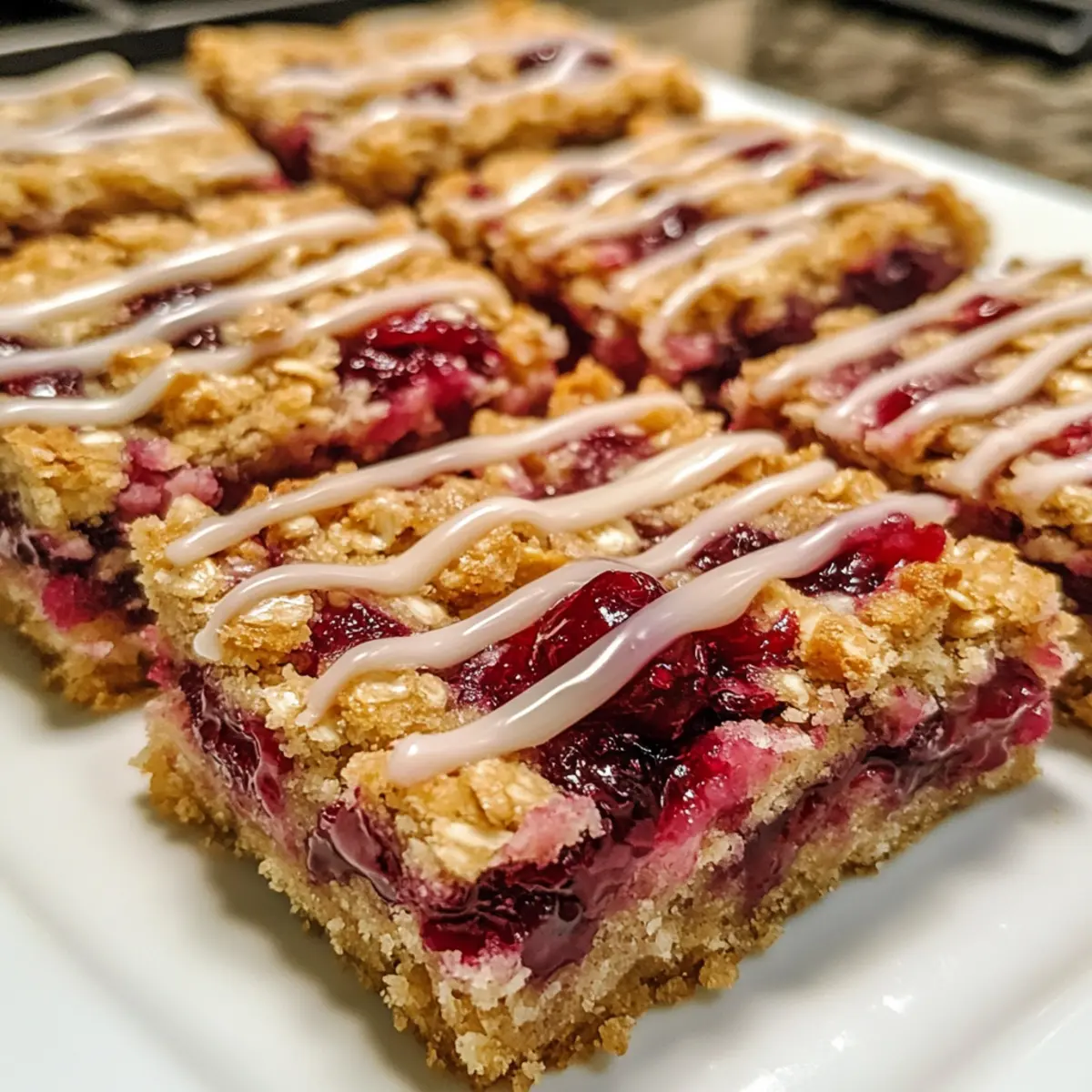 Remove your baked Cranberry Crumble Bars from the oven and allow them to cool on a wire rack for at least 30 minutes. Once cooled, whisk together powdered sugar, milk, and vanilla to create a smooth glaze, and drizzle it generously over the top for an added touch of sweetness.