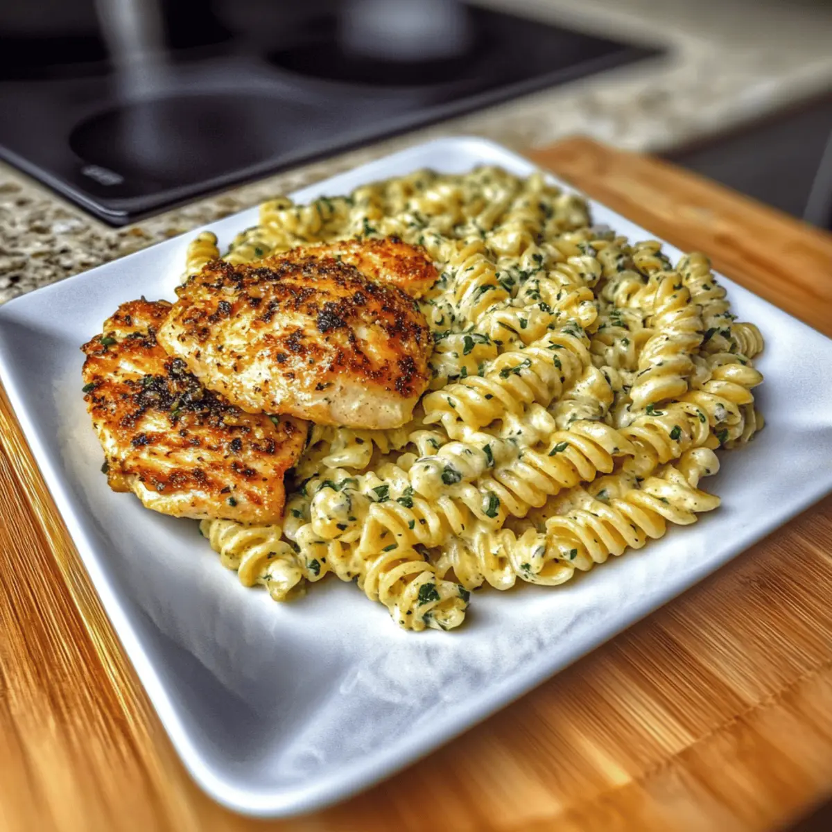 While the pasta cooks, season both sides of the chicken breasts generously with salt, pepper, and Italian seasoning. In a large skillet over medium heat, melt 2 tablespoons of unsalted butter. Add the seasoned chicken and sear for 3–4 minutes on each side until golden brown and fully cooked through. Once done, remove the chicken from the skillet and let it rest on a cutting board.