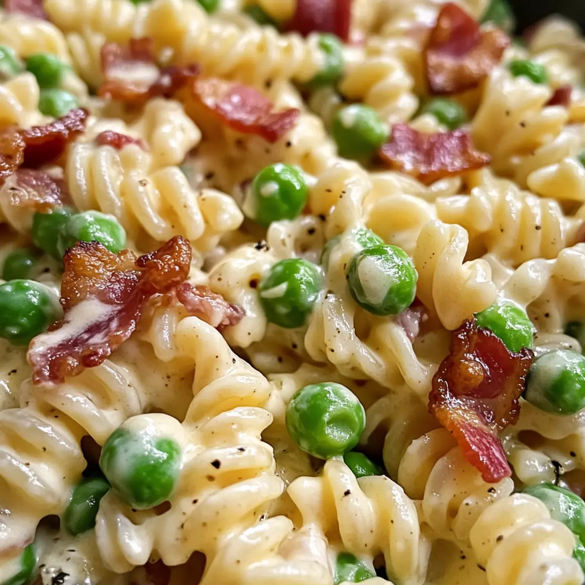 - In a large mixing bowl, combine the cooled pasta, thawed peas, crumbled bacon, and grated Parmesan cheese. Fold gently to mix.