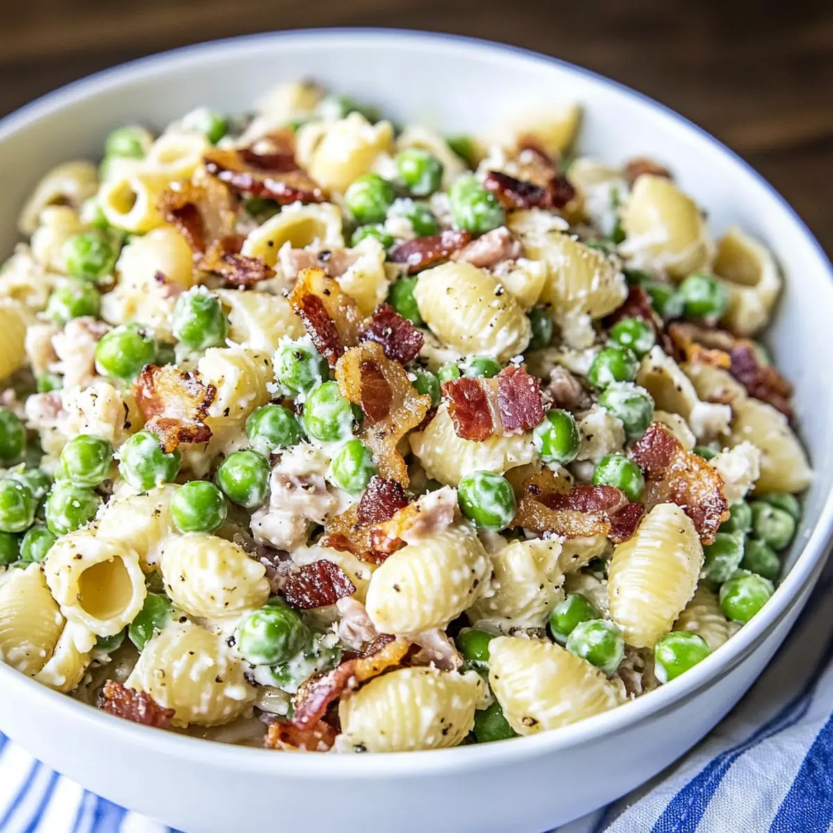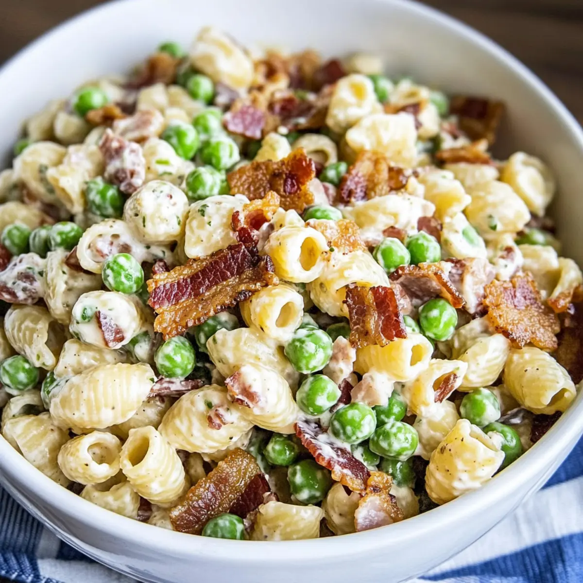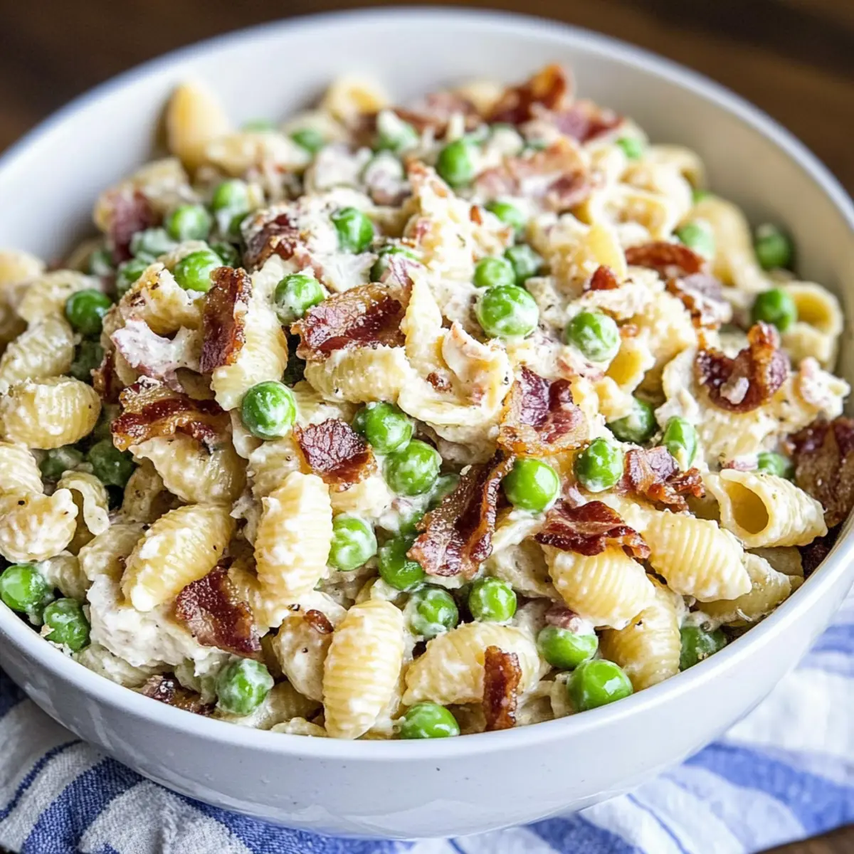 Creamy Indulgence: The silky dressing beautifully balances the savory bacon and sweet peas, creating a comforting dish that delights every bite.