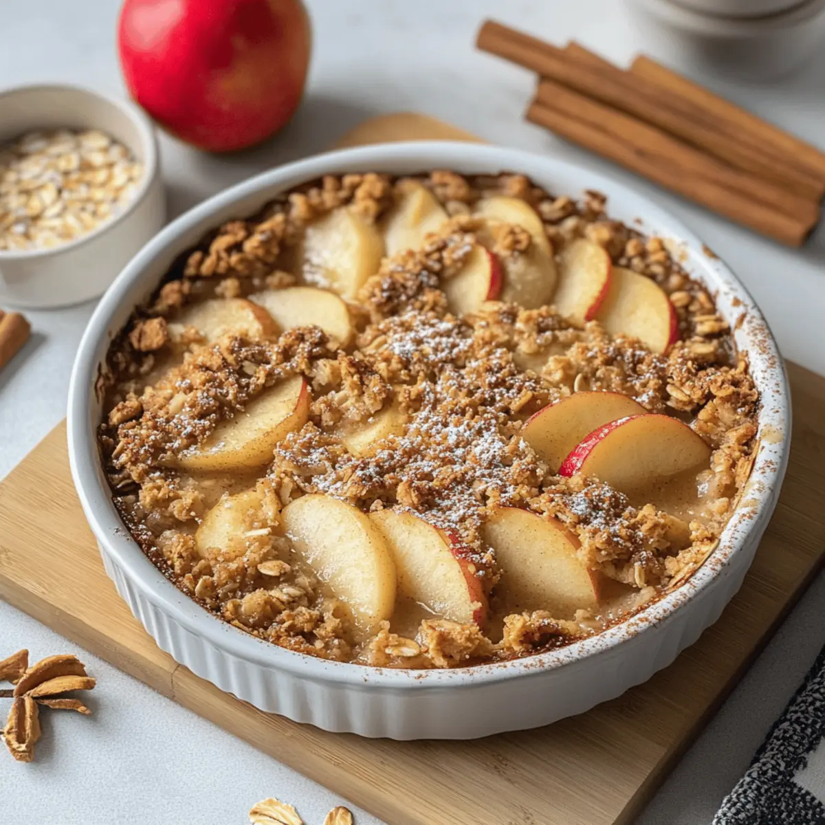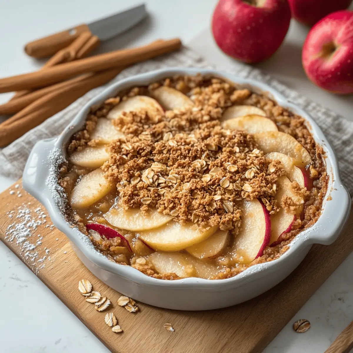 These Easy Apple Crisp with Oats are perfect for busy weeknights and meal prep enthusiasts! You can assemble the entire crisp up to 24 hours in advance. Simply prepare the apple filling and topping as directed, layer them in your baking dish, and cover tightly with plastic wrap before refrigerating. This helps the flavors meld and ensures a delicious outcome. When you’re ready to enjoy your dessert, simply bake it directly from the fridge, adding a few extra minutes to the baking time if necessary. By prepping ahead, you not only save time but also guarantee a delightful, hassle-free dessert to impress your family and friends!