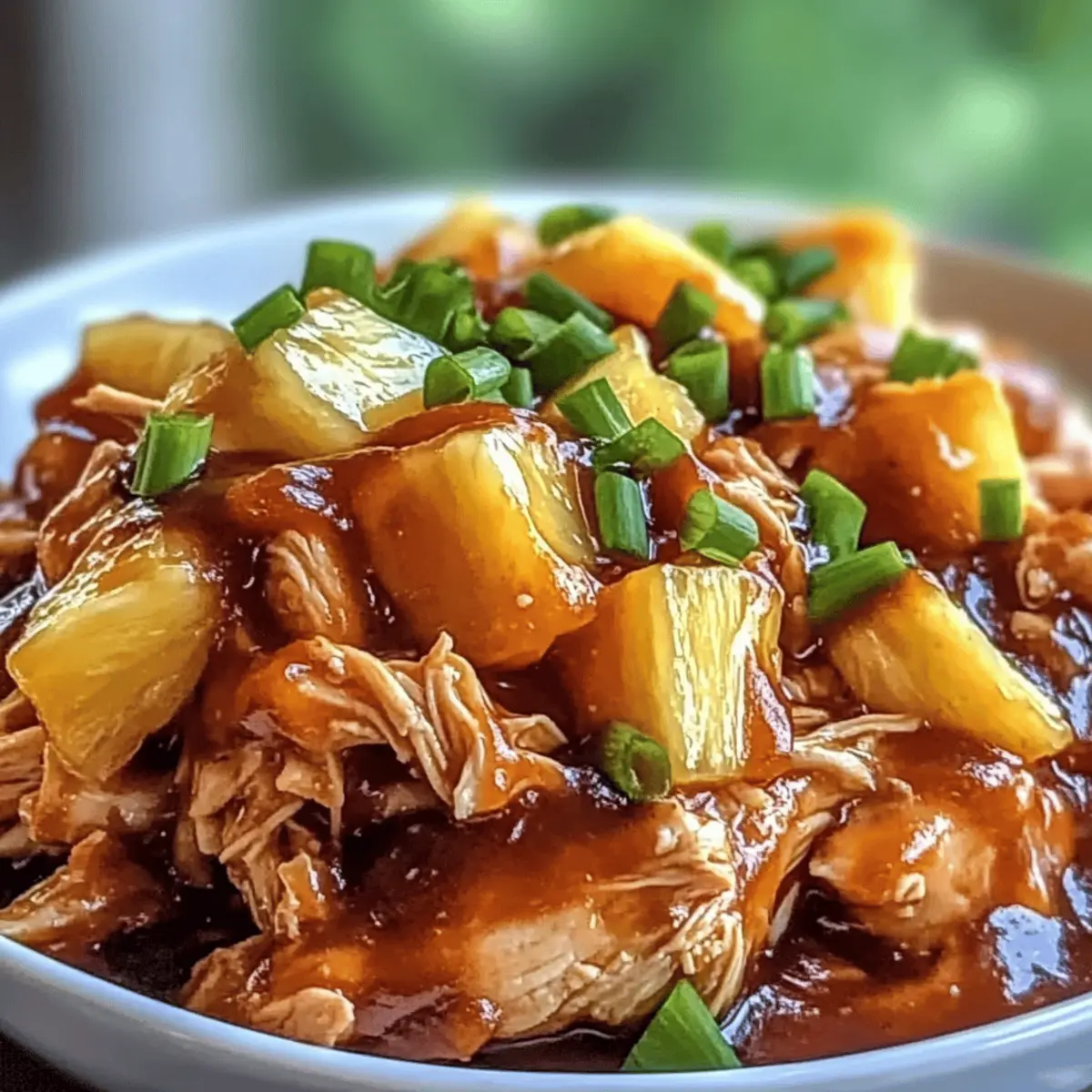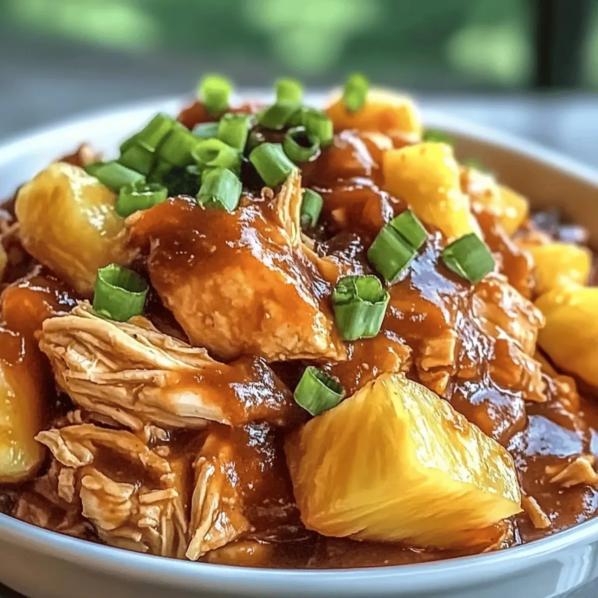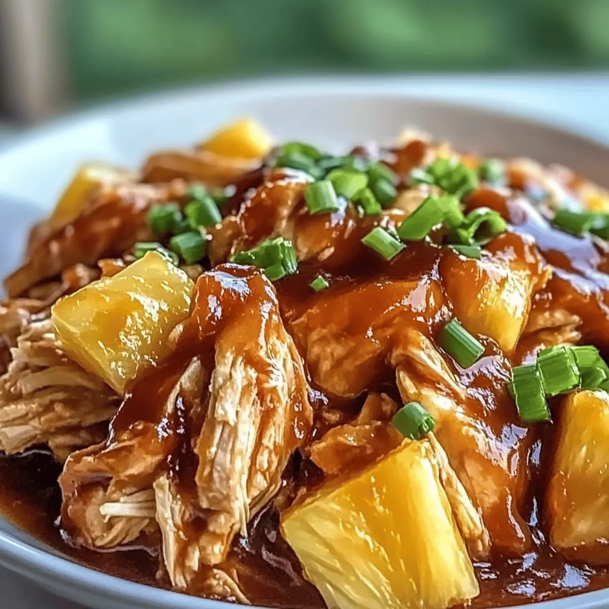 Lastly, give the chicken a good stir to coat it in the sauce once more. Before serving, sprinkle chopped green onions on top for a pop of color and a fresh crunch. Your Easy Crockpot Pineapple BBQ Chicken is now ready to be enjoyed, whether on its own or paired with your favorite sides!