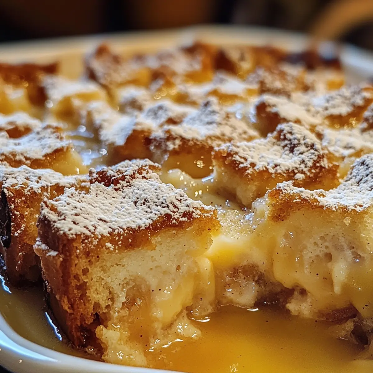 Once baked, remove the eggnog bread pudding from the oven and let it cool for 20-30 minutes. This resting time allows the pudding to set further and makes it easier to slice. Dust with powdered sugar before serving, and consider drizzling with eggnog sauce or serving alongside a scoop of vanilla ice cream to enhance this delightful holiday treat.