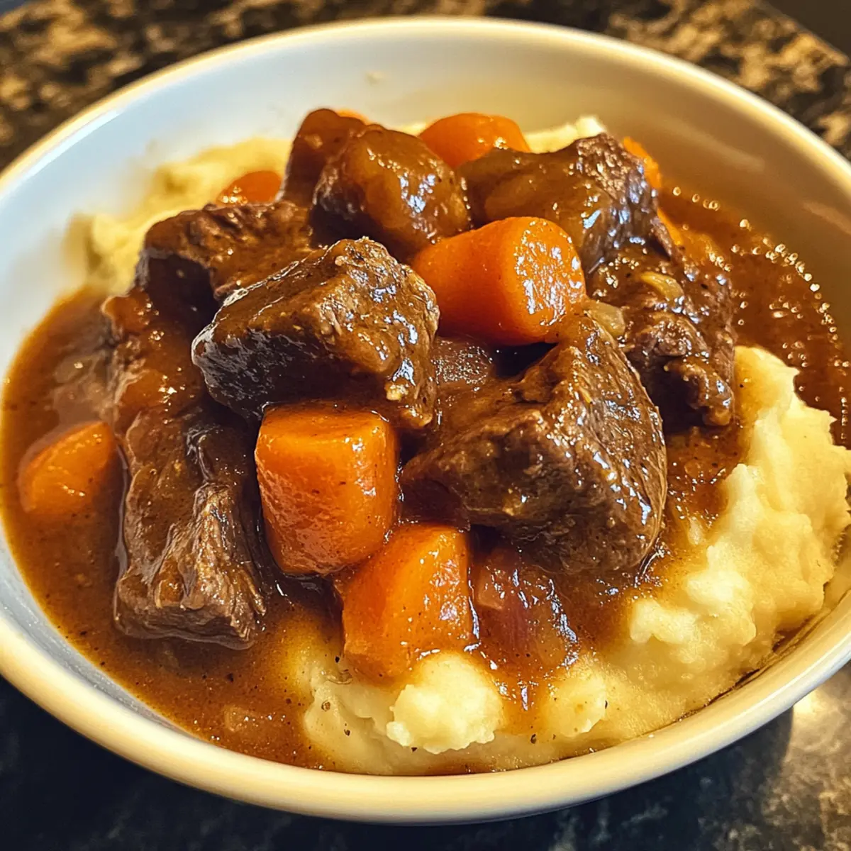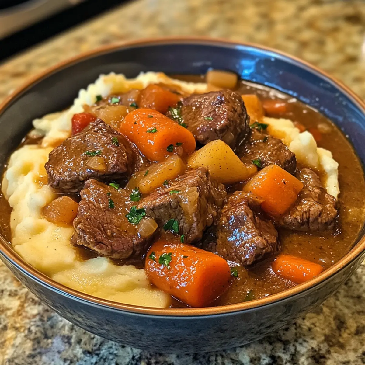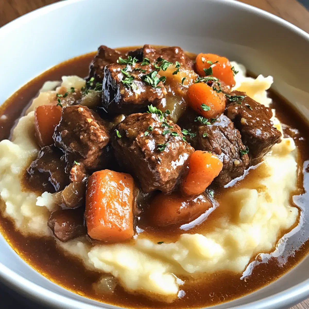 - Serve the hearty stew over the creamy mashed potatoes, garnished with chopped chives.