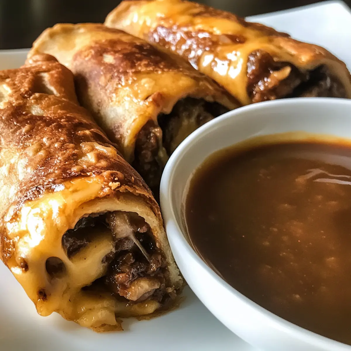 While the roll-ups are baking, prepare the au jus. In a medium saucepan, combine beef broth, Worcestershire sauce, soy sauce, garlic powder, onion powder, salt, and pepper. Bring the mixture to a gentle simmer over medium heat for 5–7 minutes, stirring occasionally. This savory dipping sauce will perfectly complement the crispy roll-ups you’ve just made.