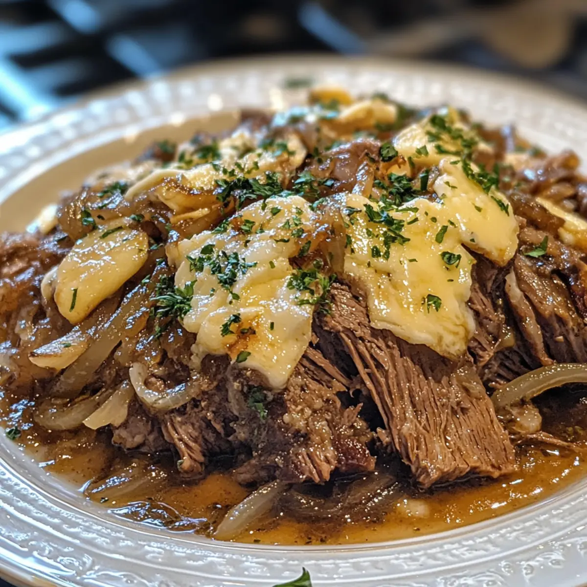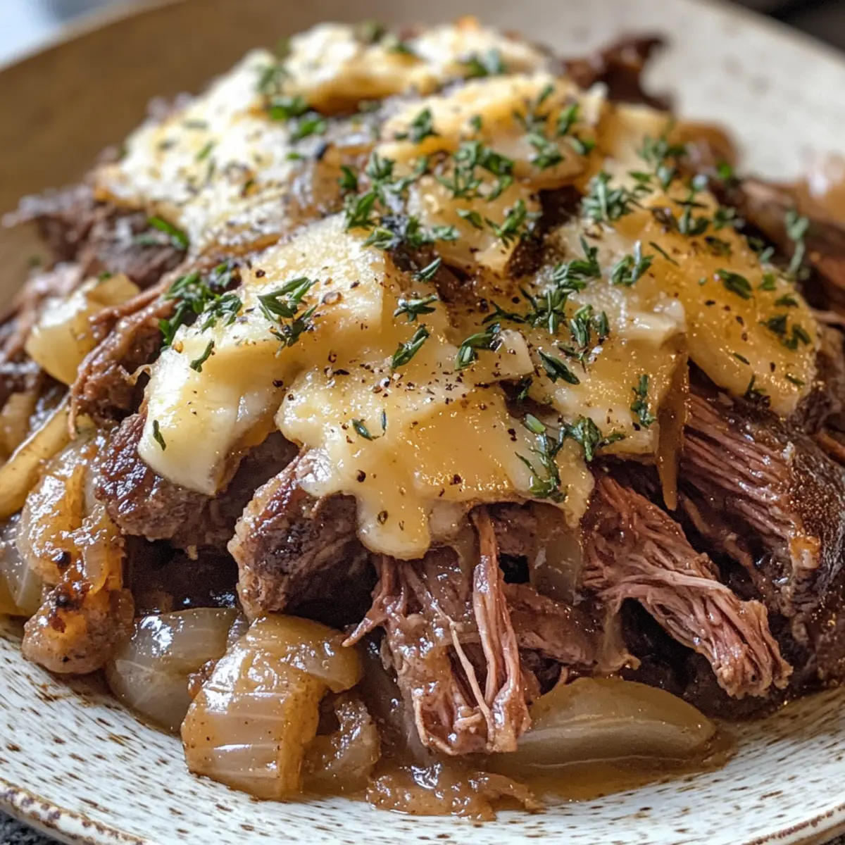 Top the shredded beef generously with Gruyere cheese, then increase your oven temperature to 400°F (200°C). Place the Dutch oven back in the oven and melt the cheese for about 5-7 minutes until bubbly and golden. This gooey topping adds a touch of indulgence to your French Onion Braised Chuck Roast, creating a delightful finish.