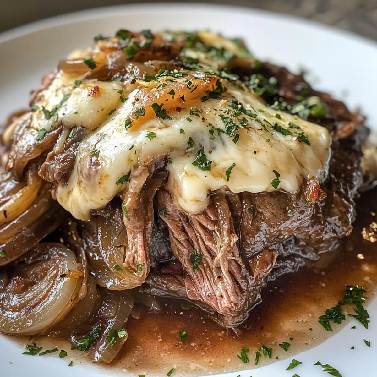 Once the cheese is melted and your roast is ready, serve warm alongside sliced baguette to soak up the rich juices. This hearty dish pairs wonderfully with mashed potatoes or roasted vegetables, ensuring every bite of your French Onion Braised Chuck Roast is as cozy and comforting as it should be.
