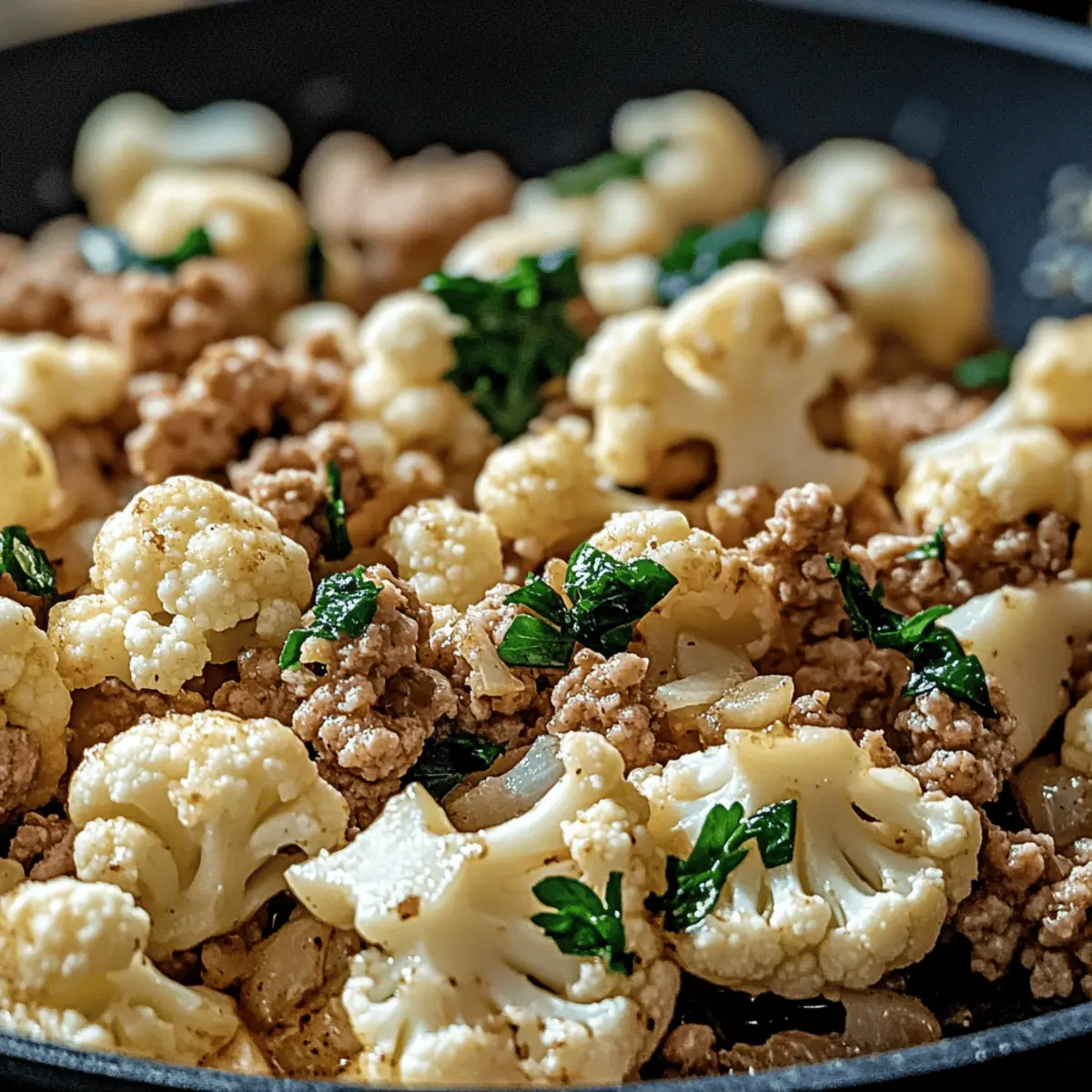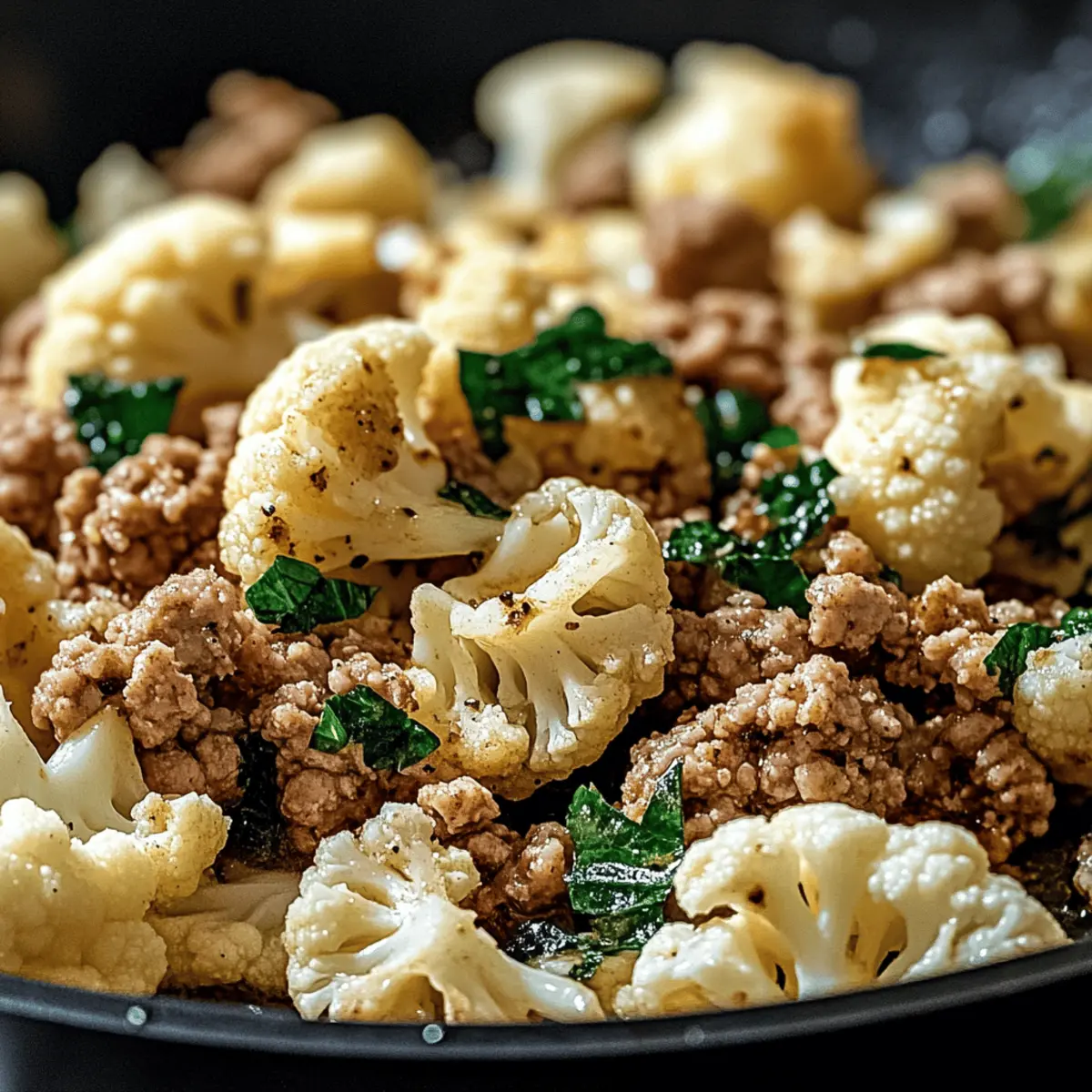 Now, return the sautéed cauliflower to the skillet, mixing it gently with the turkey and sauce. Season generously with salt, pepper, and a pinch of crushed red pepper flakes if you like a bit of heat. Stir well and cook for an additional 3–4 minutes, allowing everything to meld together and the cauliflower to heat through.