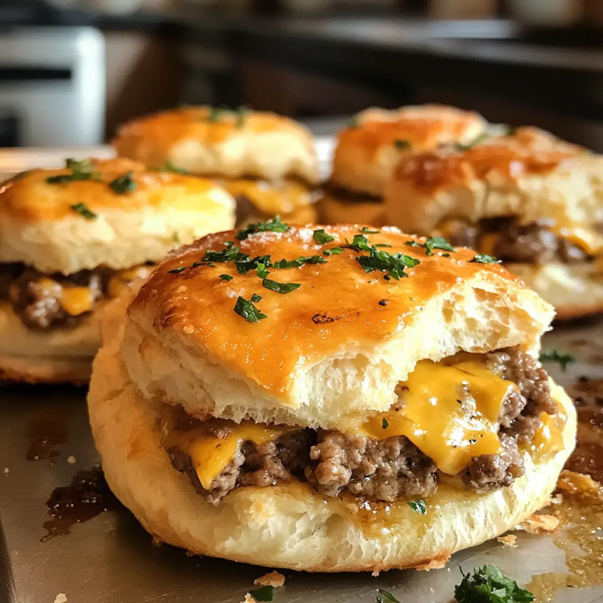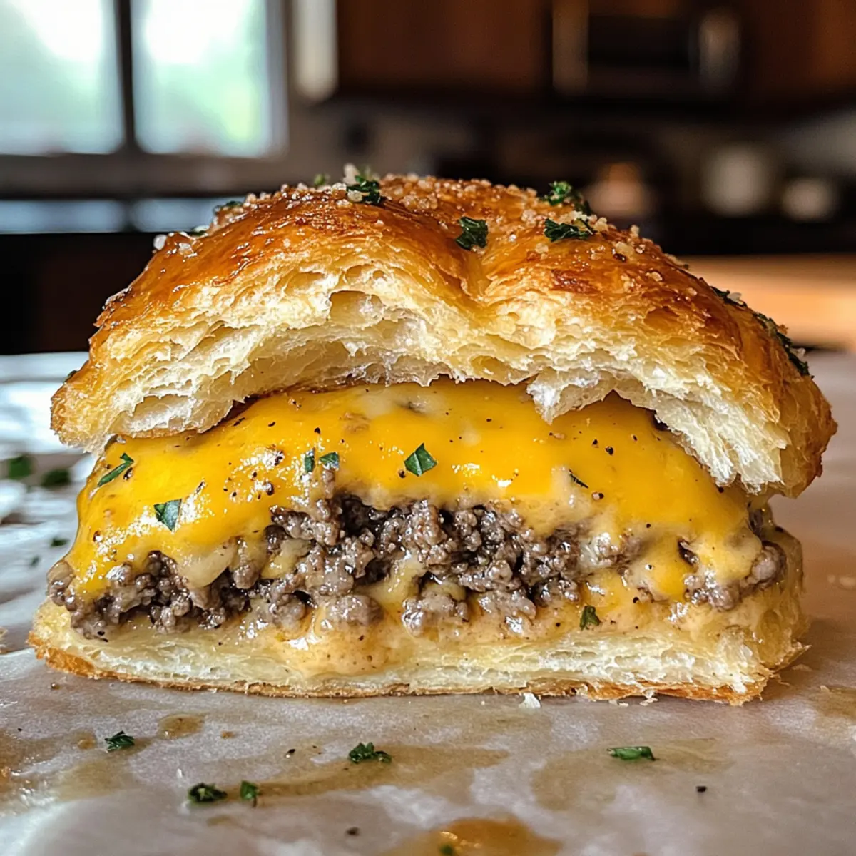 Once golden and cooked through, carefully remove the bombs from the oven. Garnish them with freshly chopped parsley for a touch of freshness. Serve these irresistible Garlic Parmesan Cheeseburger Bombs hot and watch them disappear as friends and family indulge in every cheesy, comforting bite!