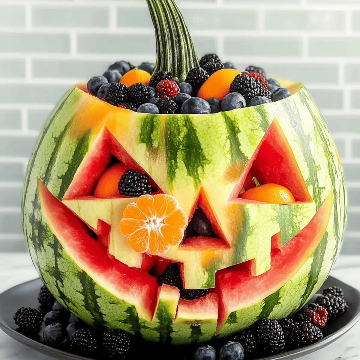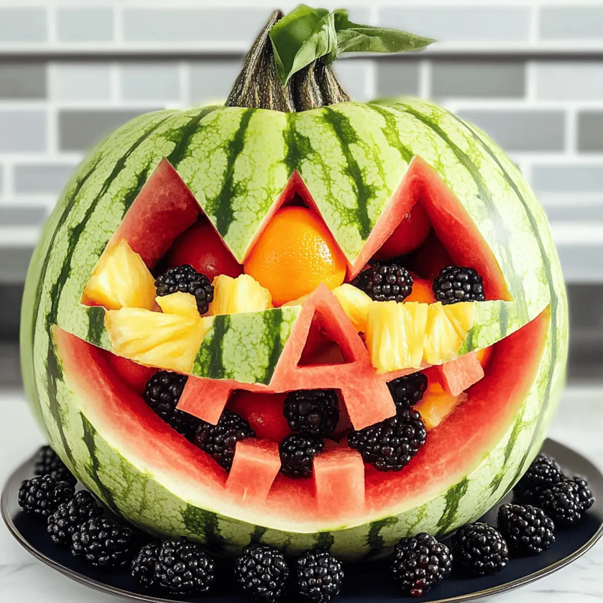 - Begin by selecting a small seedless watermelon. Carefully slice a thin layer off the bottom to create a flat base for stability. Using a sharp knife, carve out a spooky jack-o-lantern face on one side of the watermelon. Scoop out the insides with a melon baller or spoon, placing the flesh into a mixing bowl. This will be used as part of your delightful Halloween fruit salad.