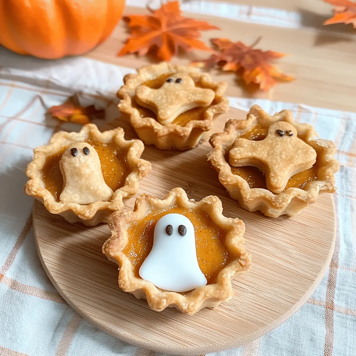 Once the pumpkin tarts have cooled slightly, carefully remove them from the muffin pan. Top each tart with the baked ghost decorations, arranging them artistically for a fun and festive presentation. This final touch transforms your tarts into charming Halloween treats that are delightful to look at and enjoyable to eat!