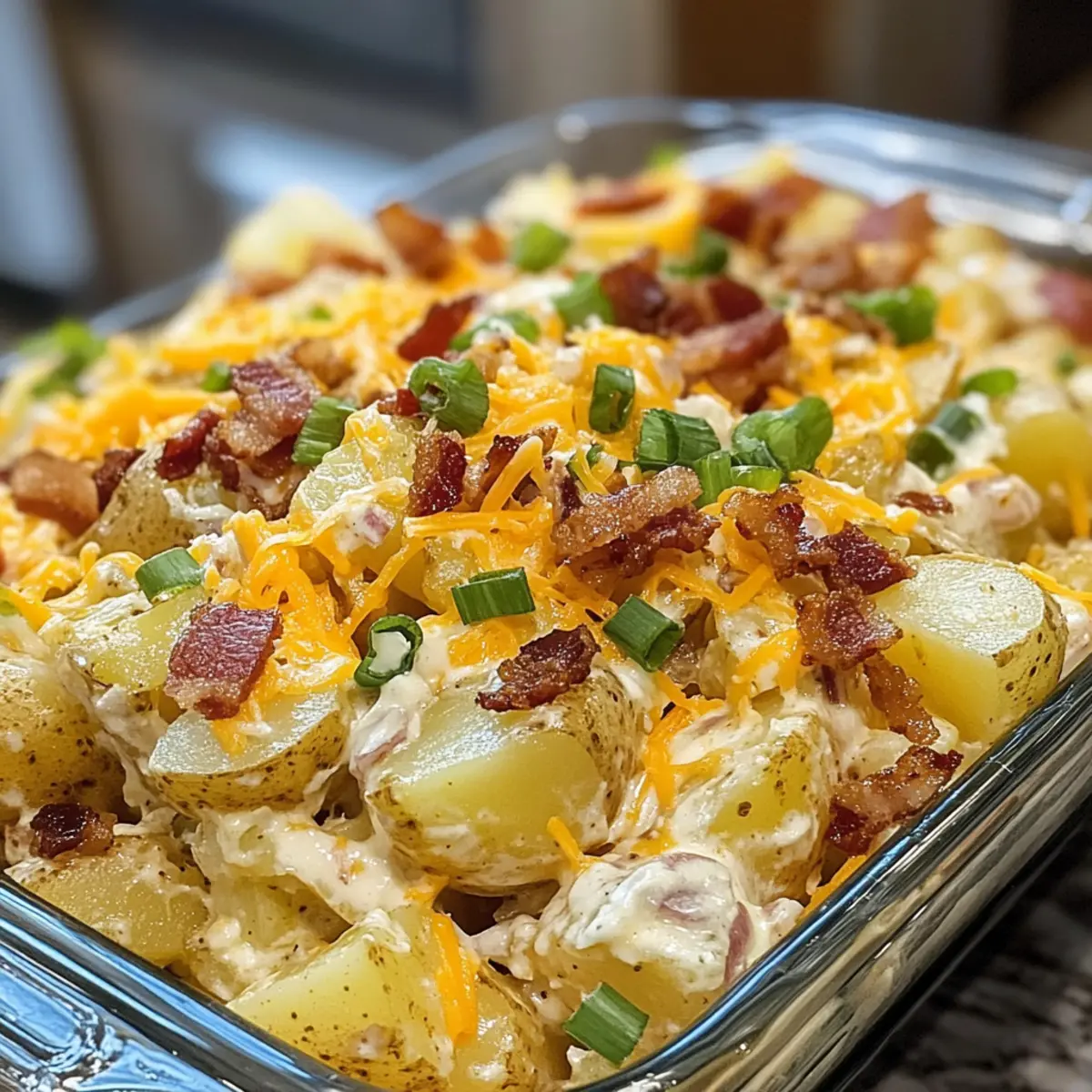 “Loaded baked potatoes are a classic comfort food that conjure images of cozy dinners and family gatherings. So, why not take that warm nostalgia and transform it into a show-stopping side dish? Enter my Loaded Baked Potato Salad! This creamy, cheesy delight takes russet potatoes and elevates them with crispy bacon, sharp cheddar, and a tangy dressing—making it the perfect companion for summer barbecues or holiday potlucks. It’s not just a salad; it’s a crowd-pleaser that allows you to savor your favorite flavors without the fuss. With minimal prep time and maximum satisfaction, you’ll find it’s the ideal recipe to bring a little joy to your table. Are you ready to dig into this flavorful twist on a classic?”