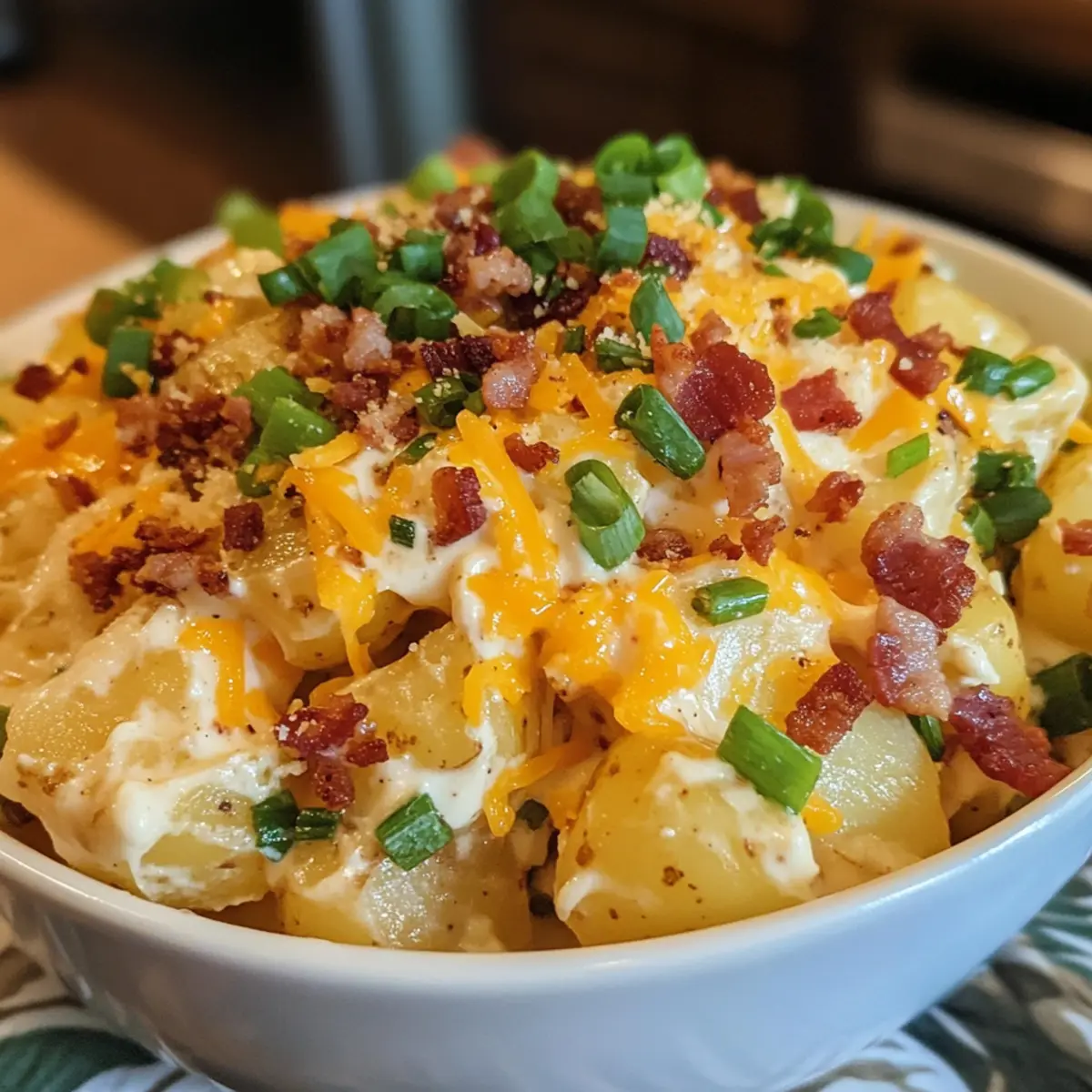 - Gently fold potato chunks into the dressing, adding bacon, green onions, and cheddar cheese.