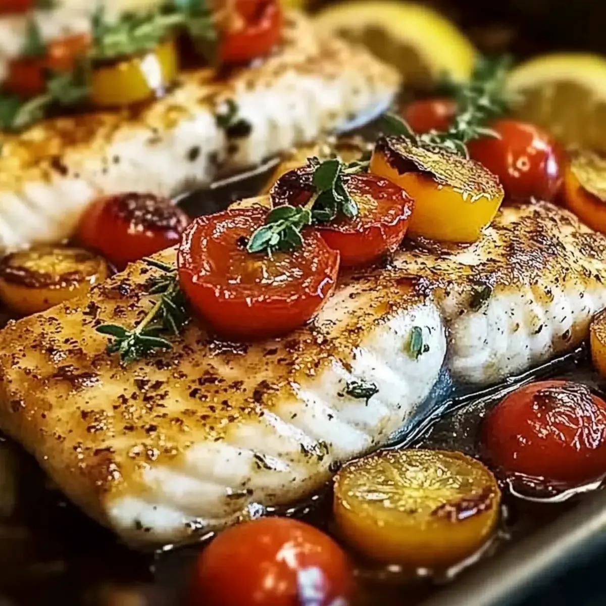Scatter halved cherry tomatoes, chopped parsley, and dill over the fish fillets, which adds a burst of color and freshness. Drizzle the fish with fresh lemon juice and sprinkle the lemon zest, allowing the bright citrus notes to permeate the dish. This step elevates the Mediterranean Baked Fish with a zesty kick that complements the flavors beautifully.