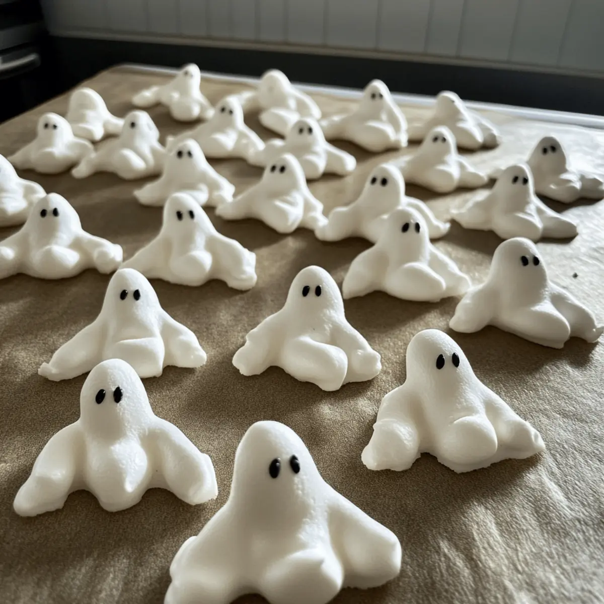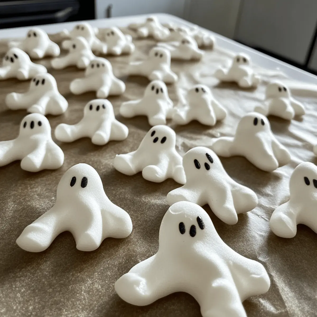 - Transfer the mixture to a piping bag and pipe ghost shapes onto parchment-lined baking sheets.