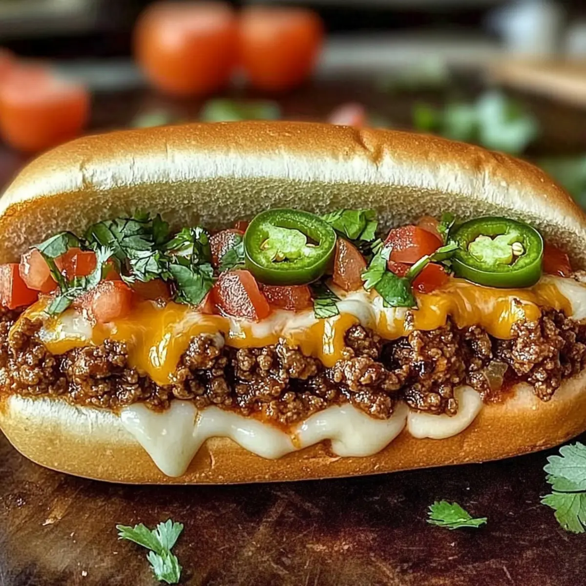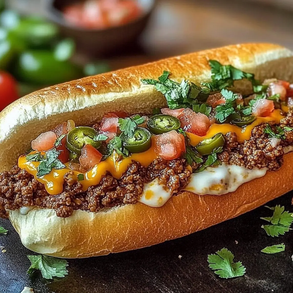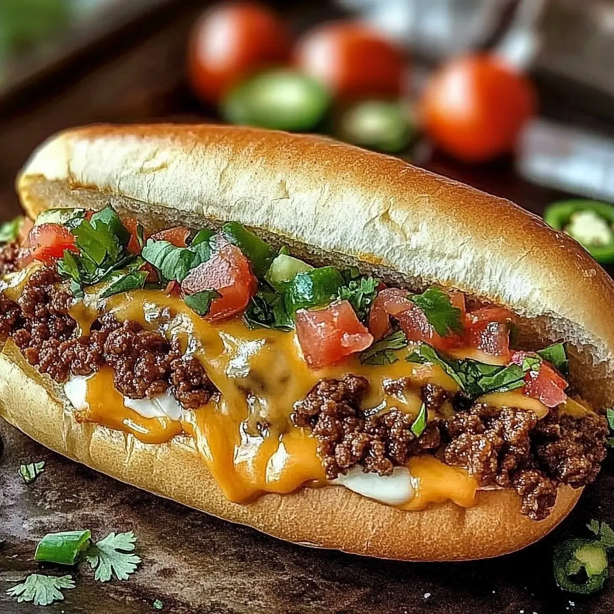 With the rolls ready, carefully spoon the cheesy beef mixture onto the bottom half of each hoagie roll, ensuring an even distribution. Top your creation with diced tomatoes, a sprinkle of chopped cilantro, and jalapeño slices if you’re feeling adventurous. These fresh toppings bring vibrant flavors to your Mexican Chopped Cheese Sandwich.
