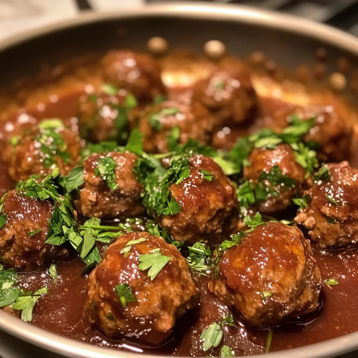 Return the meatballs to the skillet, ensuring they are submerged in the luscious sauce. Cover the skillet with a lid and reduce the heat to low. Let them braise for about 30 minutes, allowing the meatballs to absorb the rich flavors of the sauce while cooking through. Check occasionally to ensure they’re not sticking, and enjoy the enticing aromas filling your kitchen.