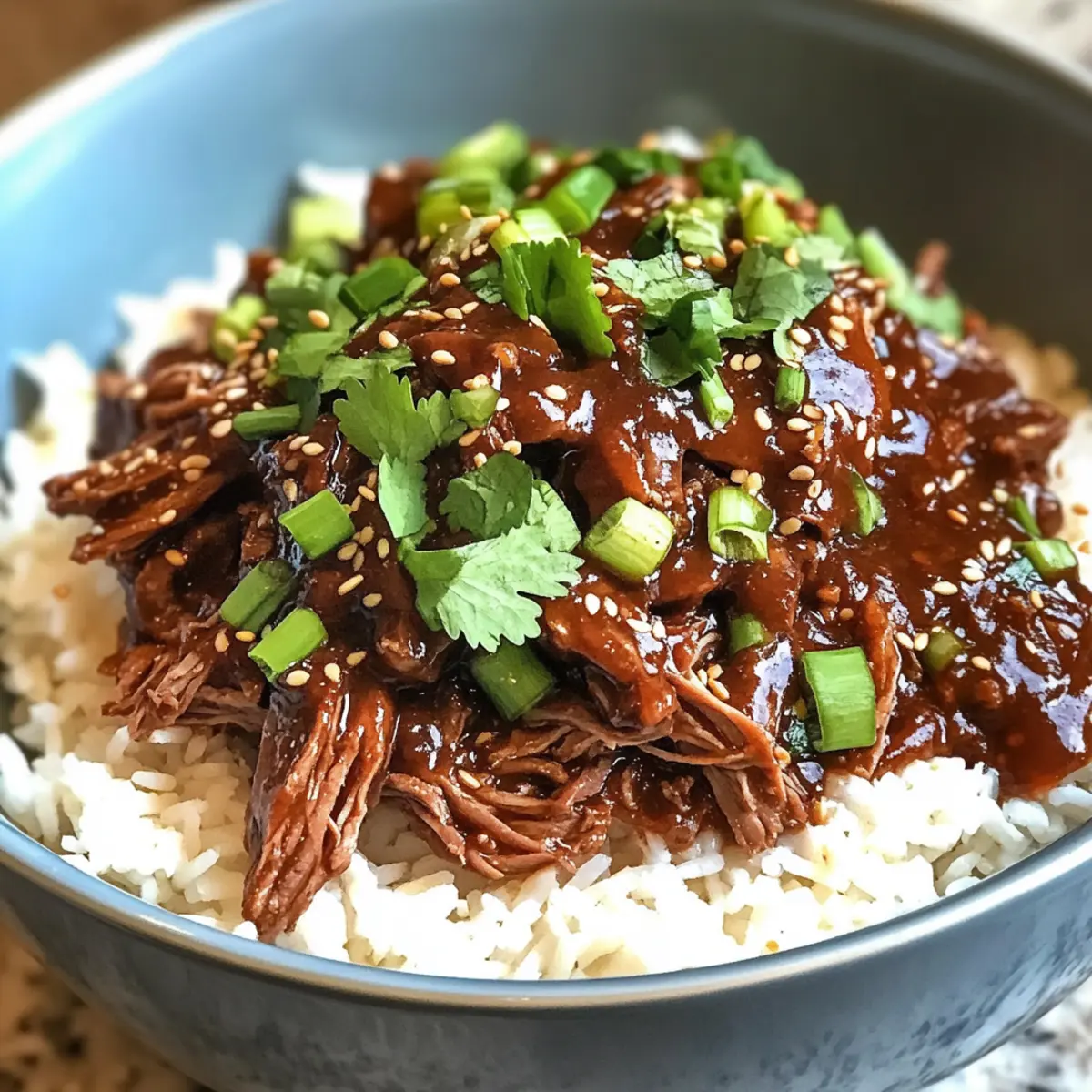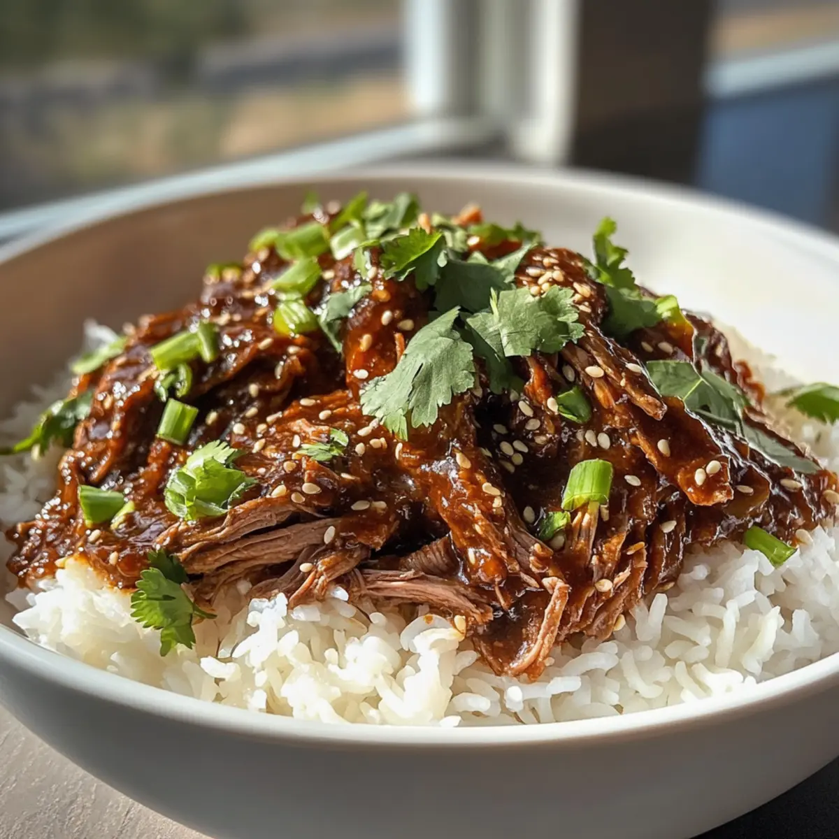 - Once cooked, shred the meat in the slow cooker and mix it with the sauce. Serve over hot cooked white rice, garnished with scallions, cilantro, and sesame seeds.