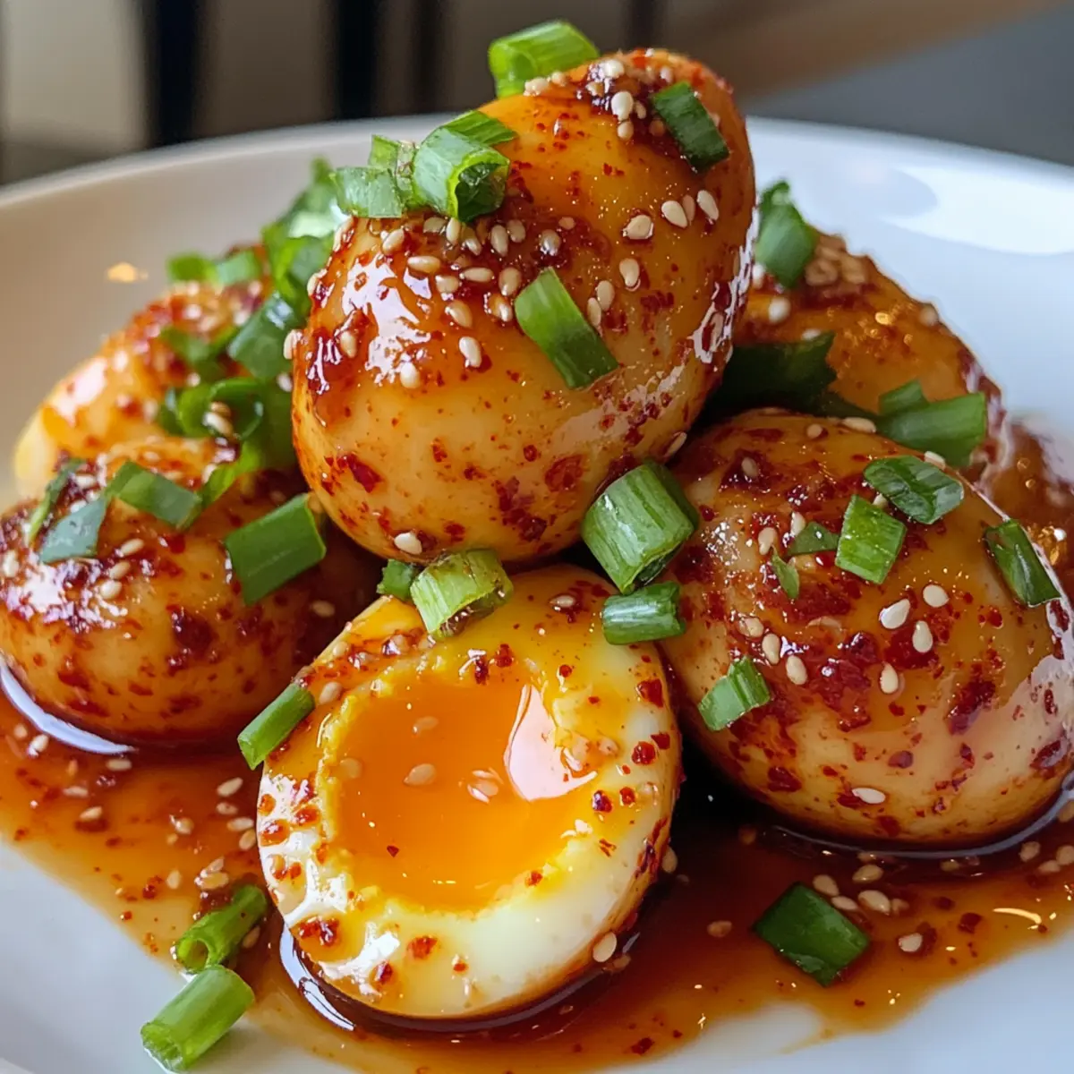 Final Touch: Don’t forget the garnish—scallions and sesame seeds elevate the look and texture of your Spicy Gochujang Eggs, making them even more inviting.