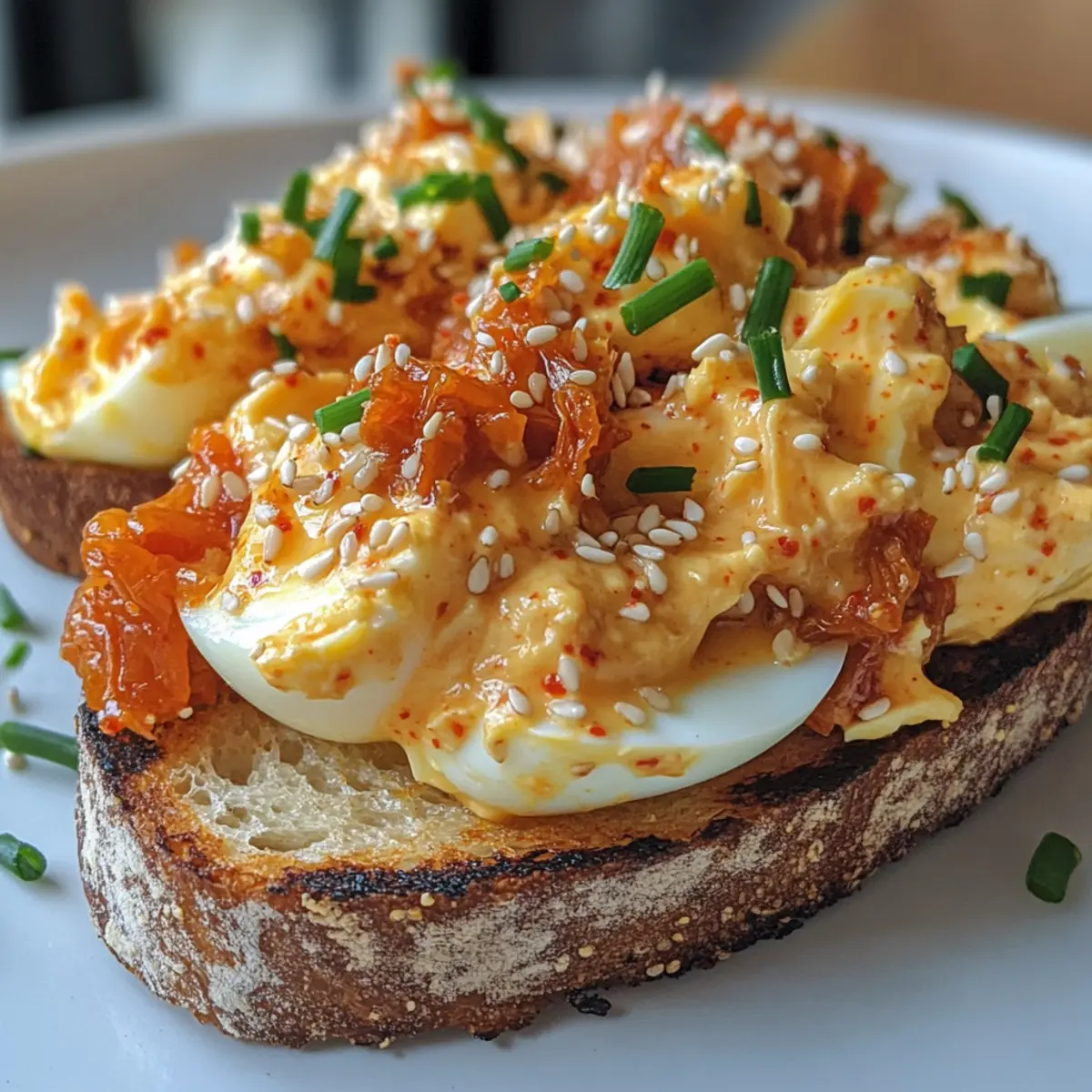 Assembly time! Place the toasted sourdough on plates, then generously spoon the creamy egg salad on top. If desired, add 4 tablespoons of kimchi for a tangy crunch. Lastly, sprinkle 1 teaspoon of toasted sesame seeds and 1 teaspoon of thinly sliced chives over the egg salad for a pop of color and flavor, bringing your Spicy Gochujang Eggs to the table with flair!