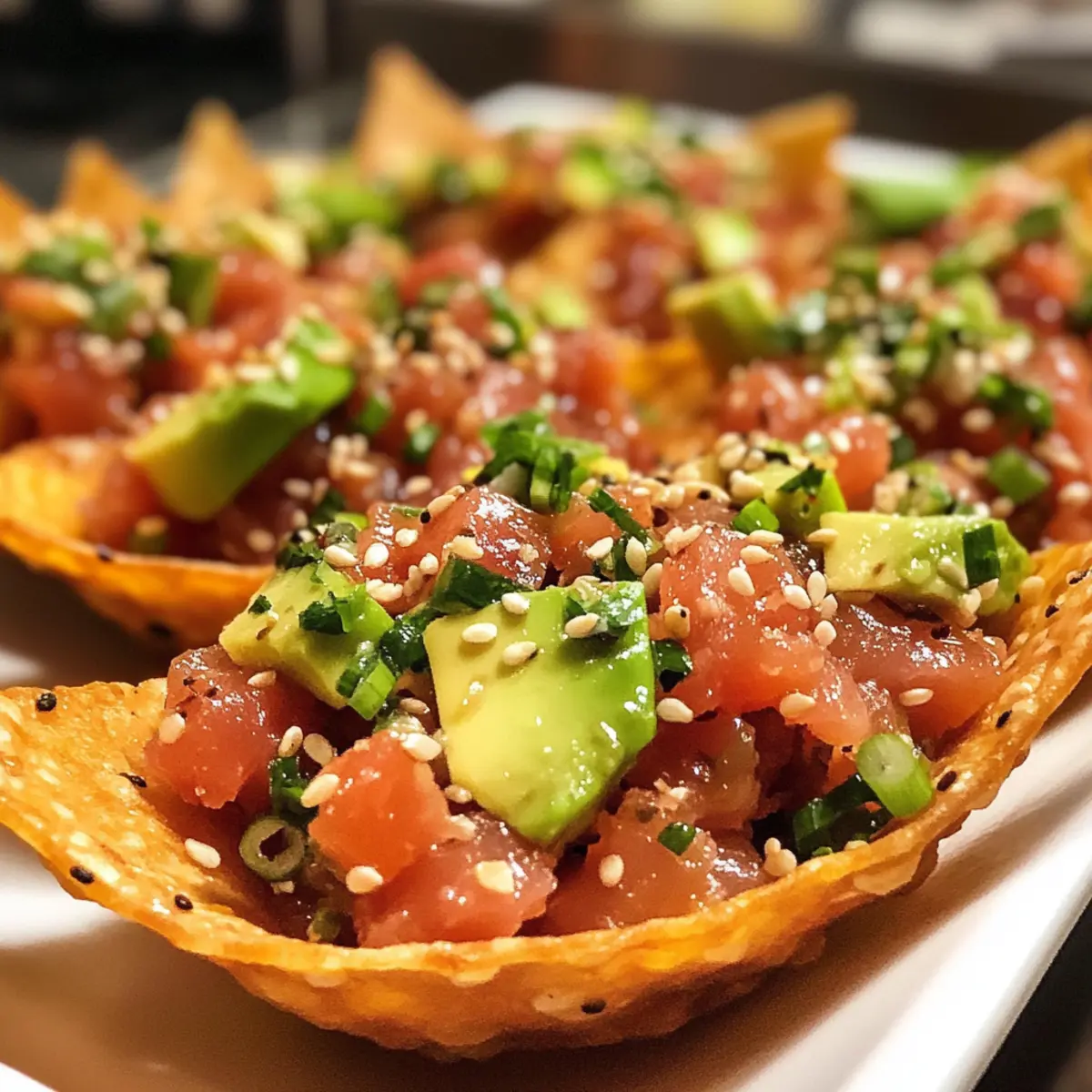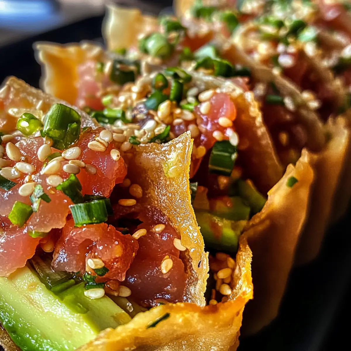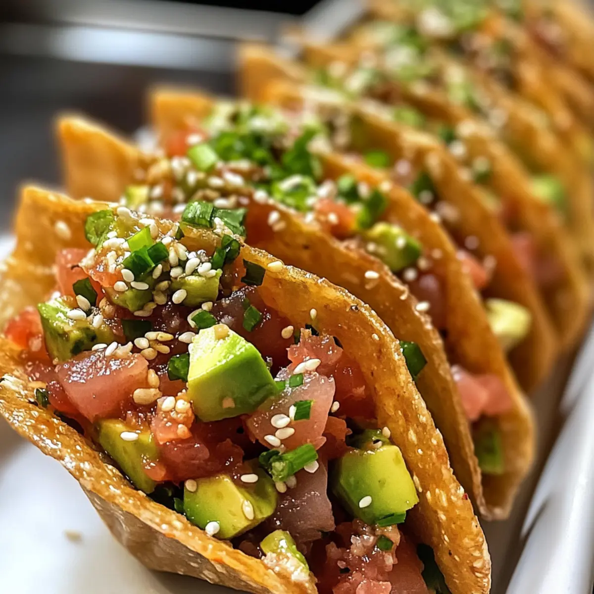 - Plate the assembled Spicy Tuna Tartare Wonton Tacos and garnish with sesame seeds and sliced green onions. Serve immediately for a satisfying crunch.