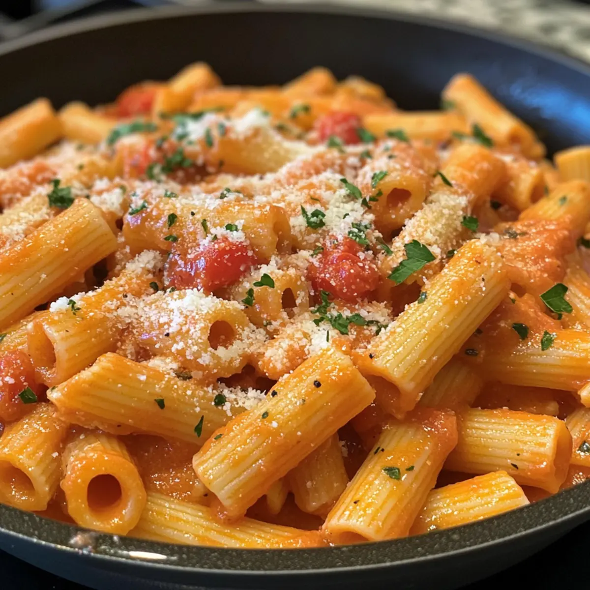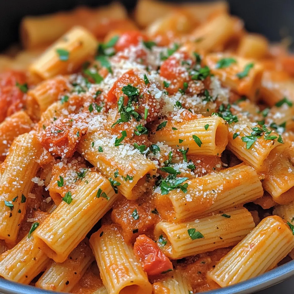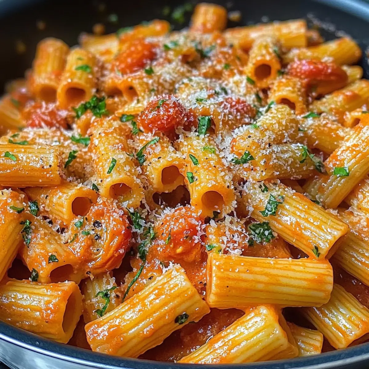 Mix in a handful of chopped parsley, 1 teaspoon of smoked paprika, and a pinch of garlic powder into the sauce. Taste and adjust with salt and pepper as needed. Once seasoned to your liking, add your cooked rigatoni pasta directly into the sauce, tossing gently to coat every piece. The hot sauce should cling to the pasta, making each bite flavorful and satisfying.