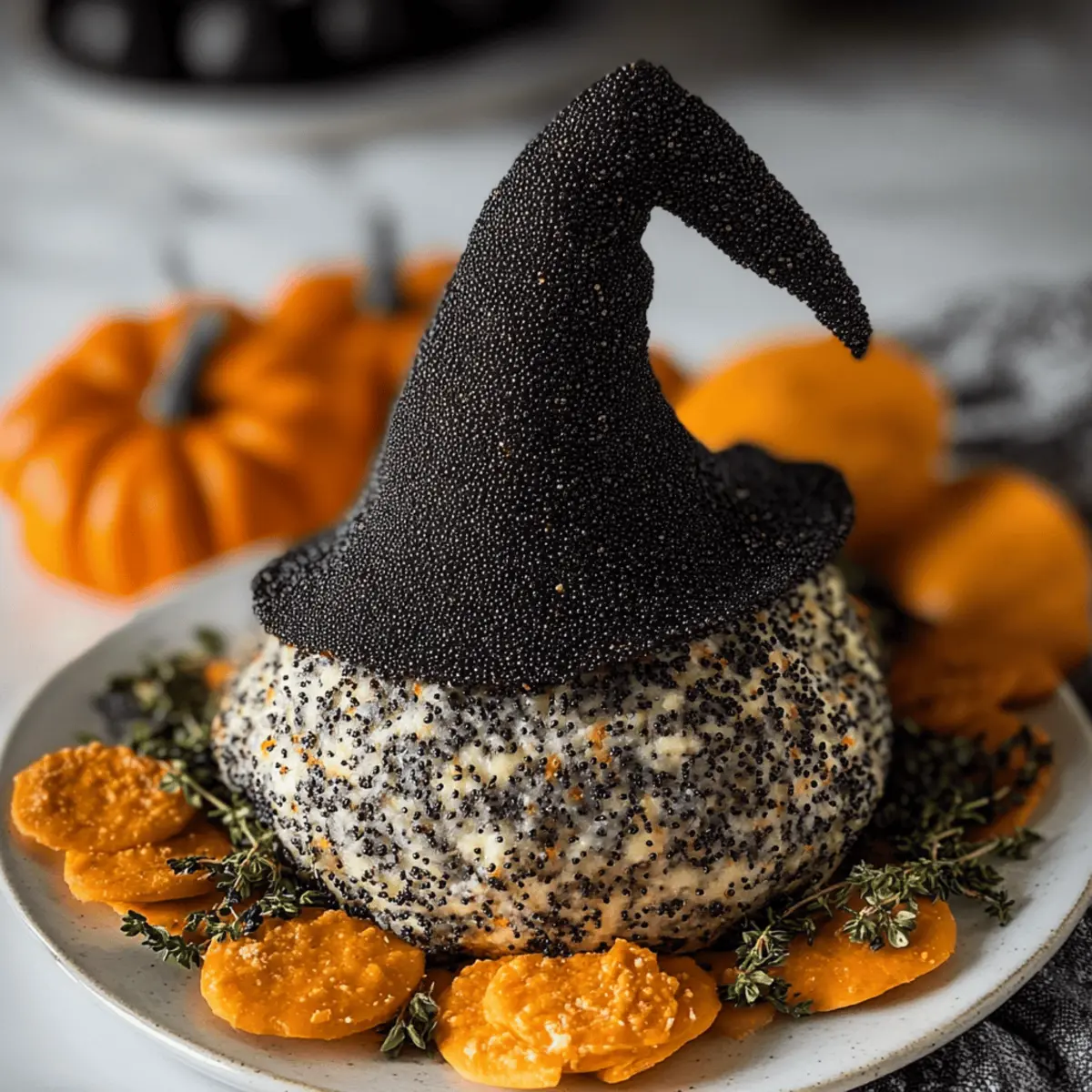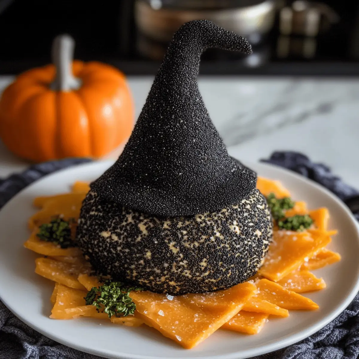 Preparation Ahead: If making in advance, assemble and chill for at least 4 hours before serving. This improves firming, flavor melding, and the overall presentation of your White Cheddar Witch Hat Halloween Cheese Ball.