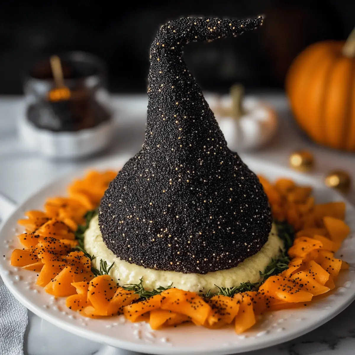 Charming White Cheddar Witch Hat Halloween Cheese Ball Delight