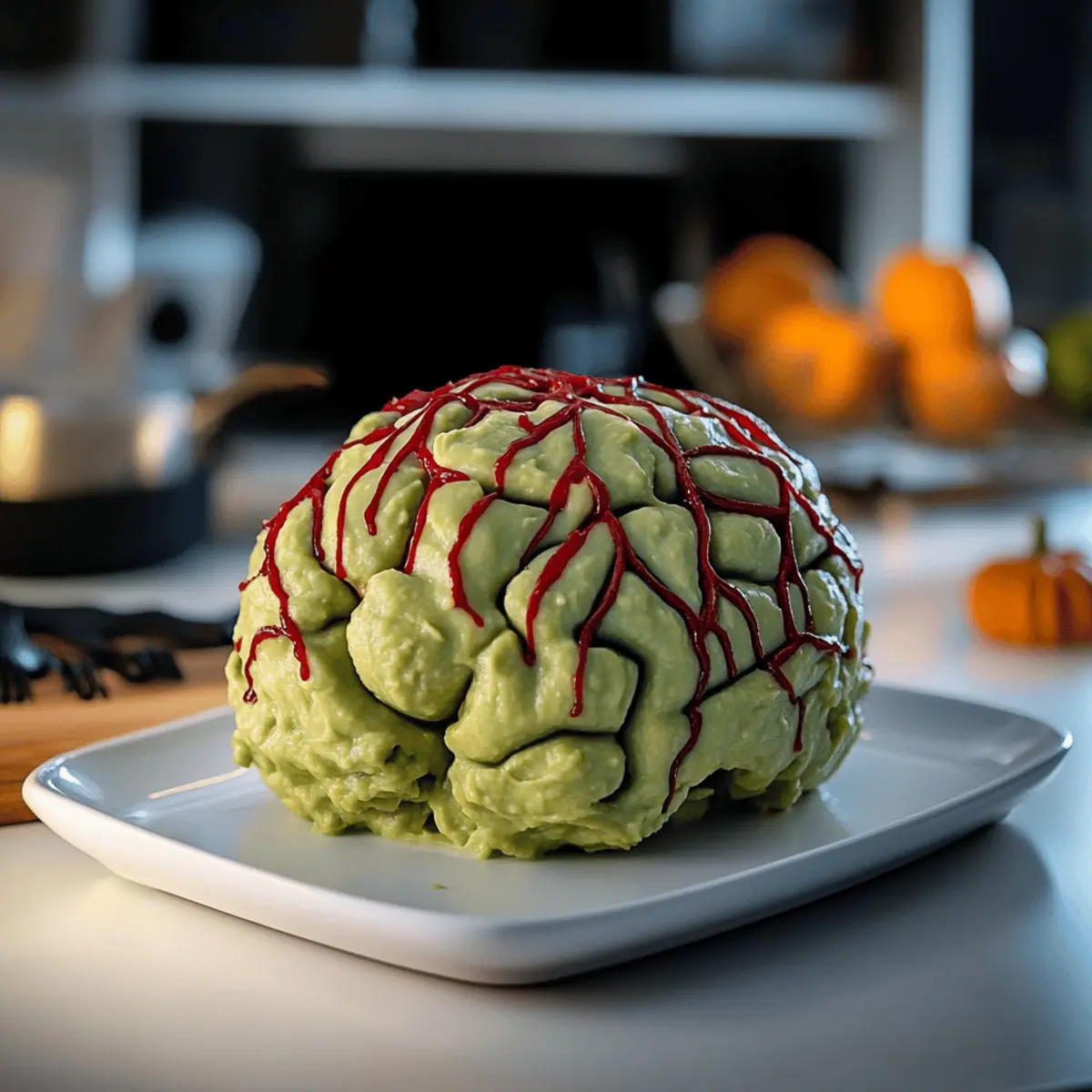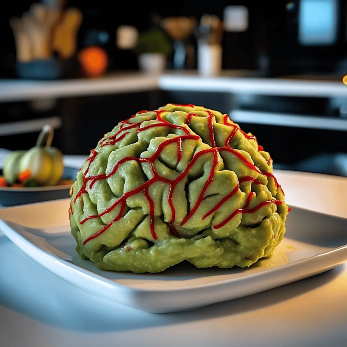 - Transfer guacamole to a platter and shape into a brain-like figure.